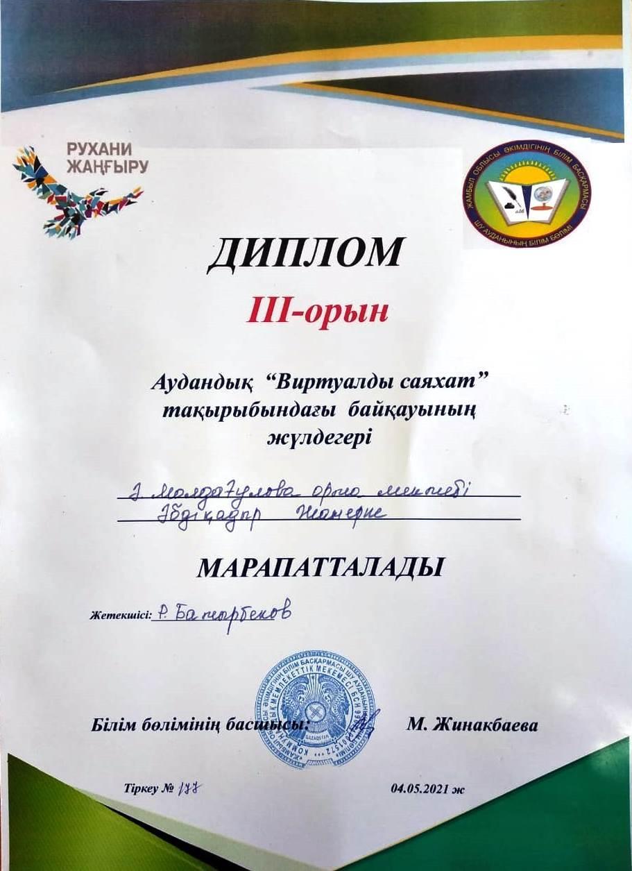 18 мамыр 2021 0 1 2 3 4 5 Оқушы жетістігі Мектебімізден аудандық "Виртуалды саяхат" байқауына оқушымыз Әбдіқадыр Жанерке қатысып, жүлделі ІІІ орынға ие болды. Жеңімпаз оқушымызды құттықтаймыз. Жетекшісі: Р.Батырбеков