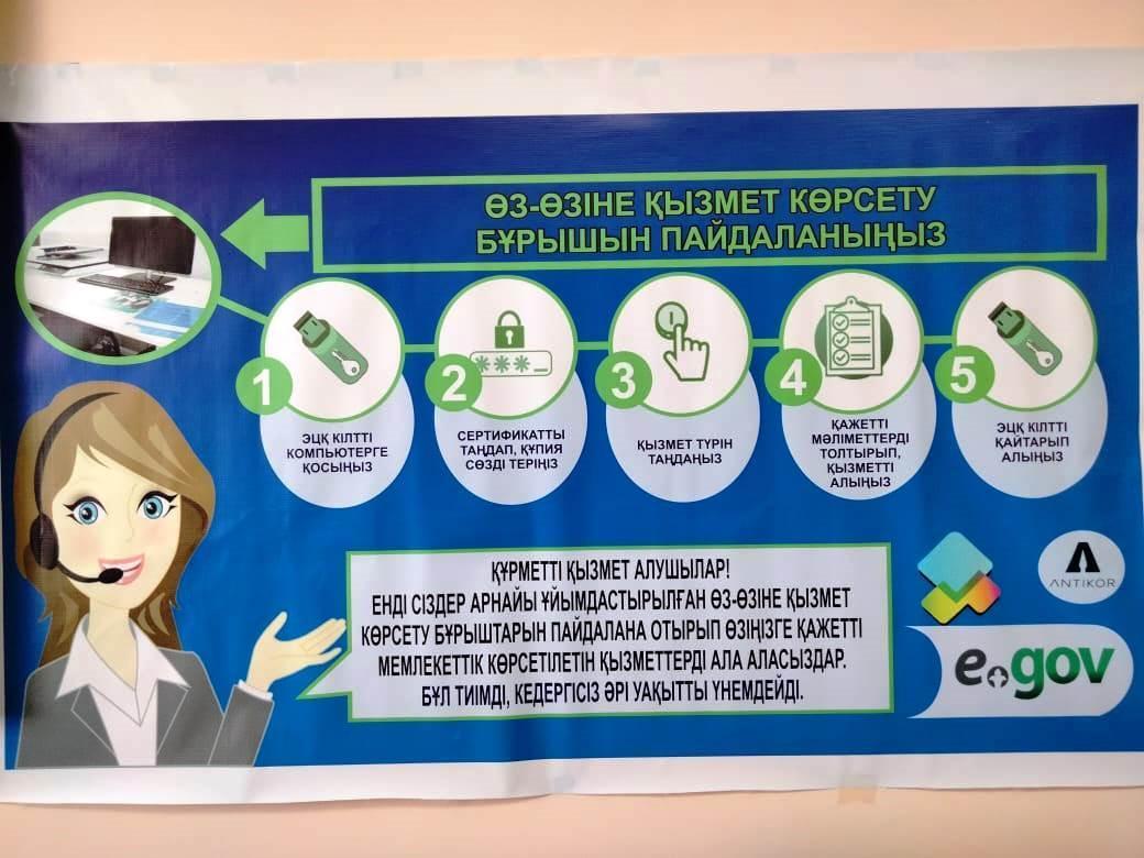 Өзіне-өзі қызмет көрсету бұрыштарында кез-келген азамат өздігінен ақпарат ала алады. Қызметтерді алу кезінде азаматтарға бетперде тағып, арақашықтықты сақтау қажет.«Egov.kz» электронды веб-порталы арқылы электронды қызметтерді алу бойынша, жауапты маман көмек көрсететін болады.