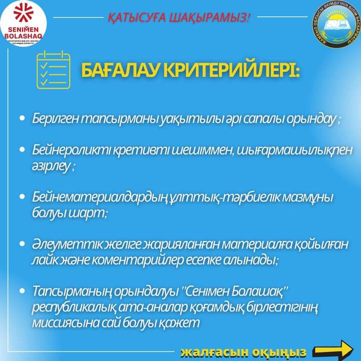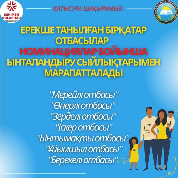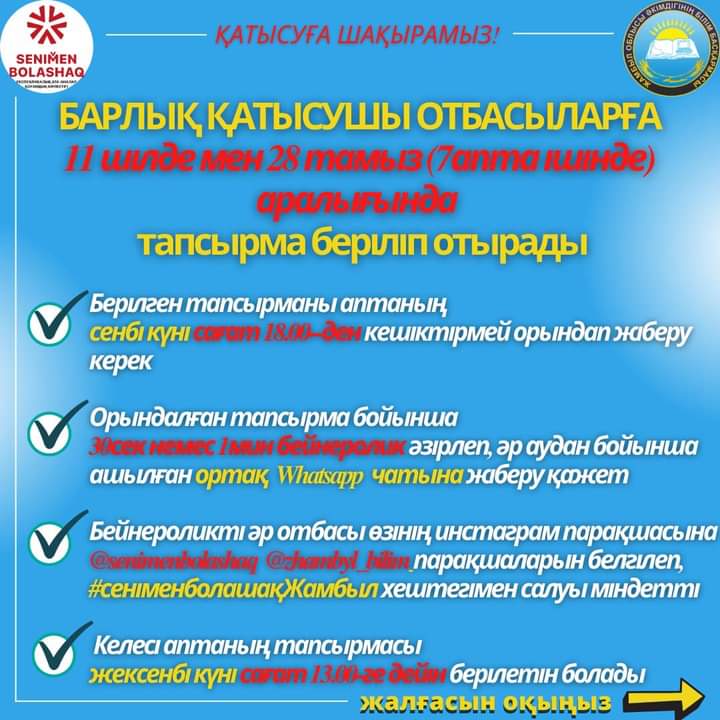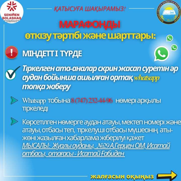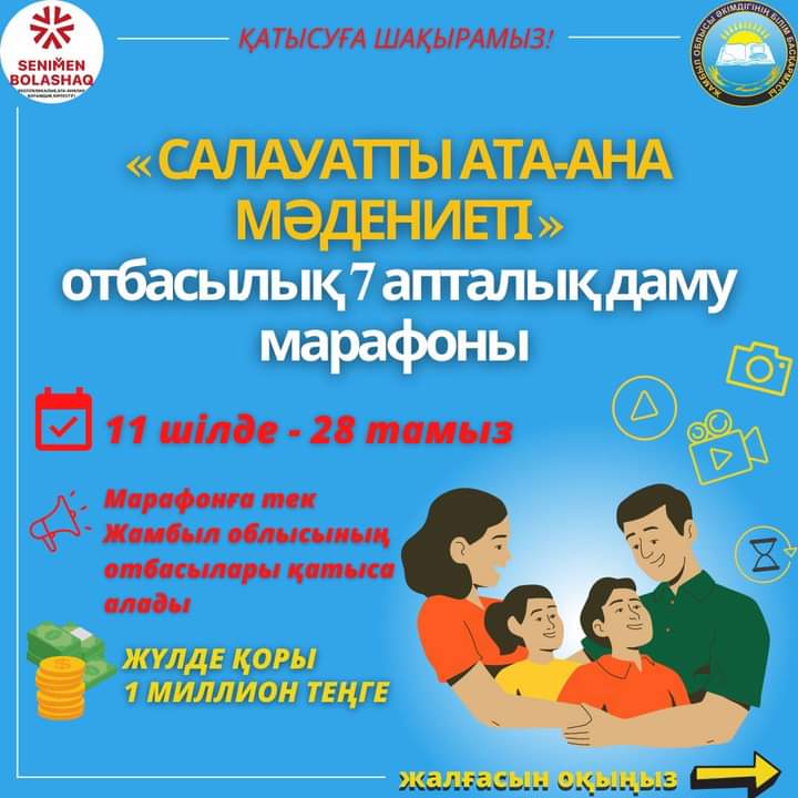Ата-аналар назарына! Жамбыл облысы әкімдігі білім басқармасы мен «Сенімен Болашақ» Республикалық ата-аналар қоғамдық бірлестігінің ұйымдастыруымен «Салауатты ата-ана мәдениеті» марафоны басталуда. Марафон 11 шілде мен 28 тамыз аралығында өтеді. Марафонға қатысуға шақырамыз!