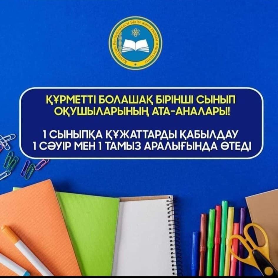 2023-2024 оқу жылына оқушыларды 1 сыныпқа қабылдау 1 сәуірде басталып, 1 тамызда аяқталады.
