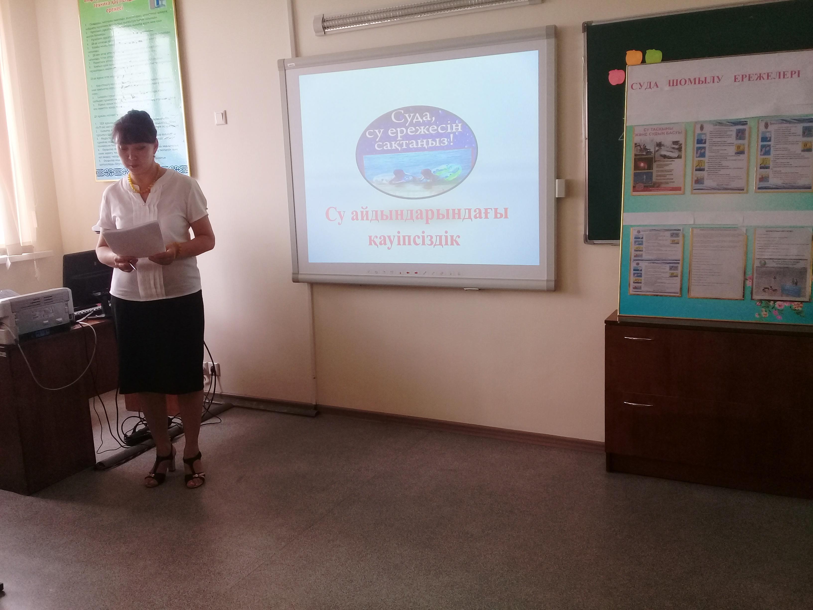 «Су айдындарындағы қауіпсіздік» ережелерімен директордың тәрбие ісі жөніндегі орынбасары Уәлиева Гүлғайша жаз мезгілінде балаларды үлкендердің қарауынсыз өзенге,каналға жібермеу керектігін, балаларға суға түсу кезіндегі қауіпсіздік ережелерін үнемі естен шығармау керектігін түсіндіріп отыру қажет, суда тентектік жасауға болмайды. Балаларды судағы қауіпті жағдайлардан қорғау әрбір ата-ана міндеті екендігін естен шығармауымыз керектігін айтып жеткізді. Судағы негізгі қауіпсіздік ережелерін қатаң сақтап естен шығармау үшін оларға бейнероликтер көрсету арқылы түсіндірме жұмыстары жүргізіліп, ата-аналарға жадынамалар таратылды. Сондай-ақ мектеп фойесінде «Суға шомылу ережелері» бұрыш ұйымдастырылып, судағы қауіпсіздік ережелері туралы жадынамалар ілінді.