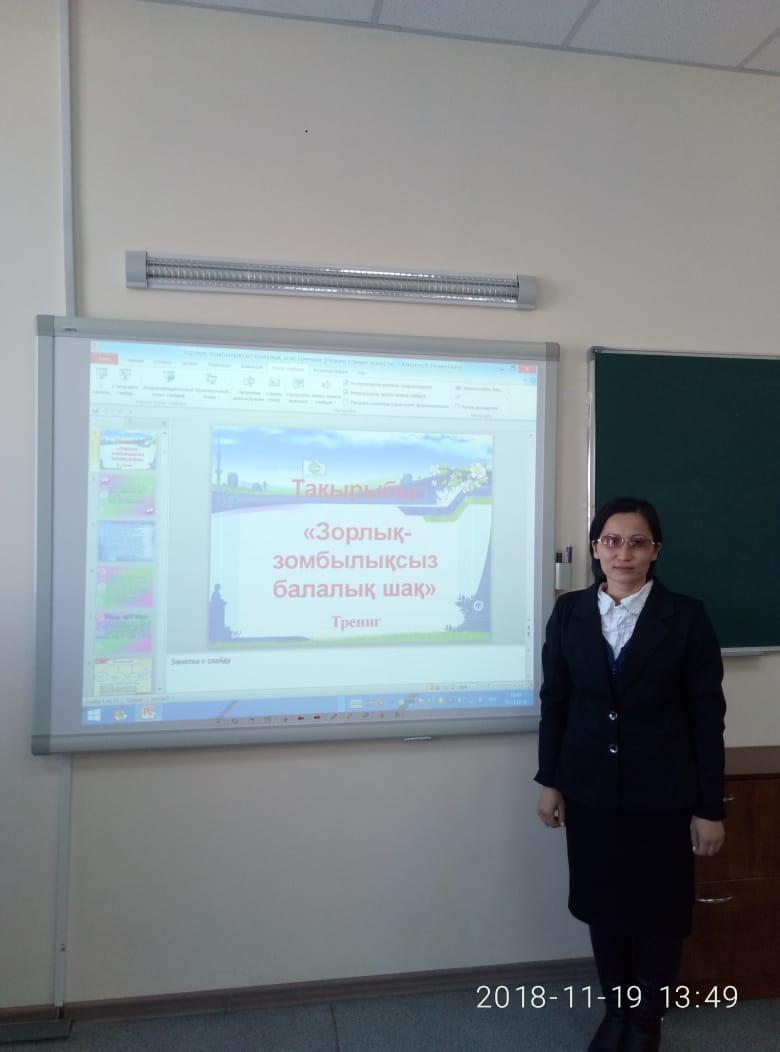 Зорлық-зомбылықтың алдын-алу, түсіндіру жұмыстарын жүргізу мақсатында 8-9-10сынып оқушыларына тәлімгер Қ. Нұрманова мектептегі әлімжеттік, бопсалау, күш көрсету арқылы оқушылардан ақша жинайтындарға қалай төтеп беруге болатындығын насихаттайтын бейнероликтер көрсетті. Оқушыларға түсіндіру жұмыстары слайд арқылы жүргізілді.