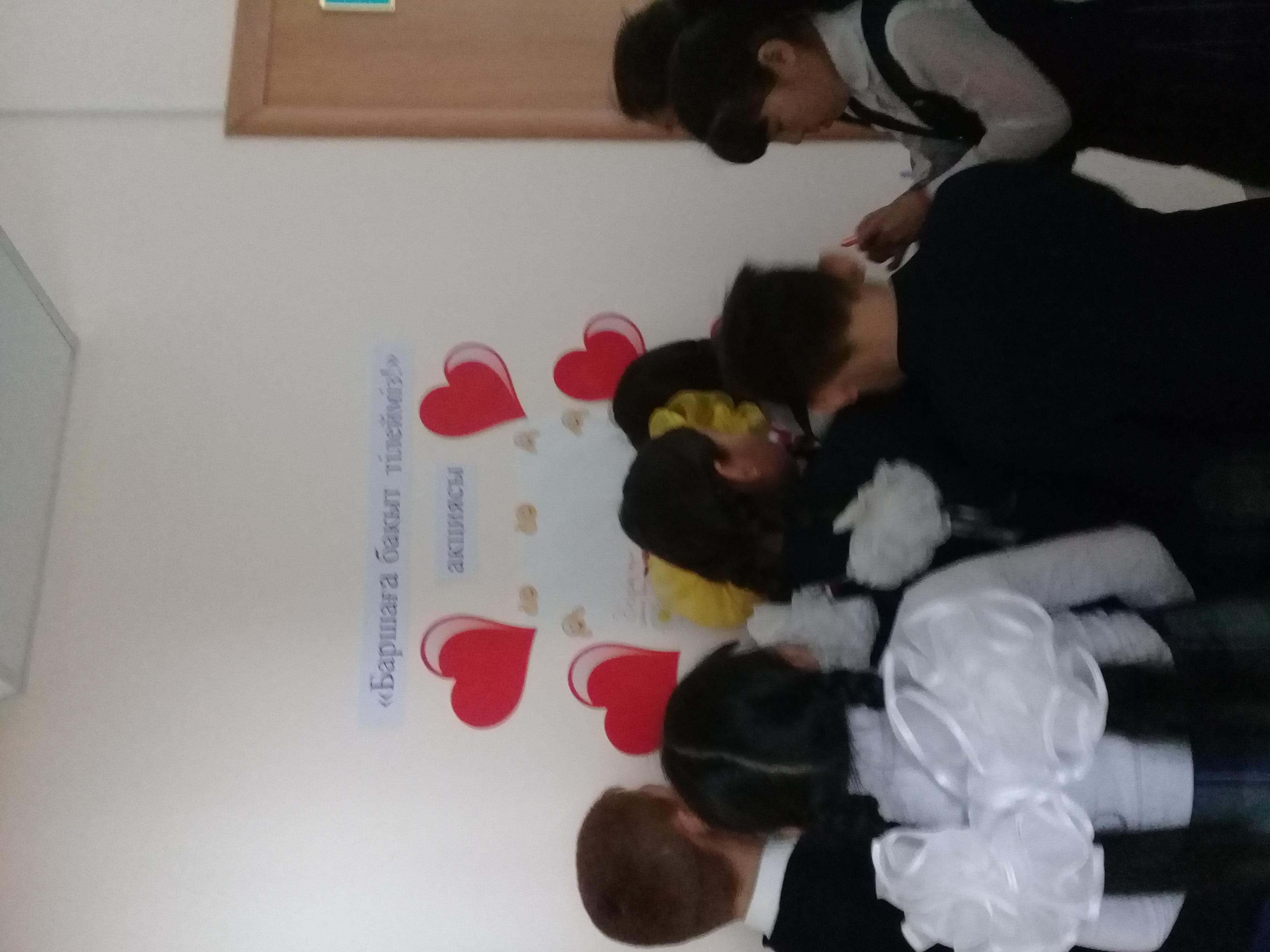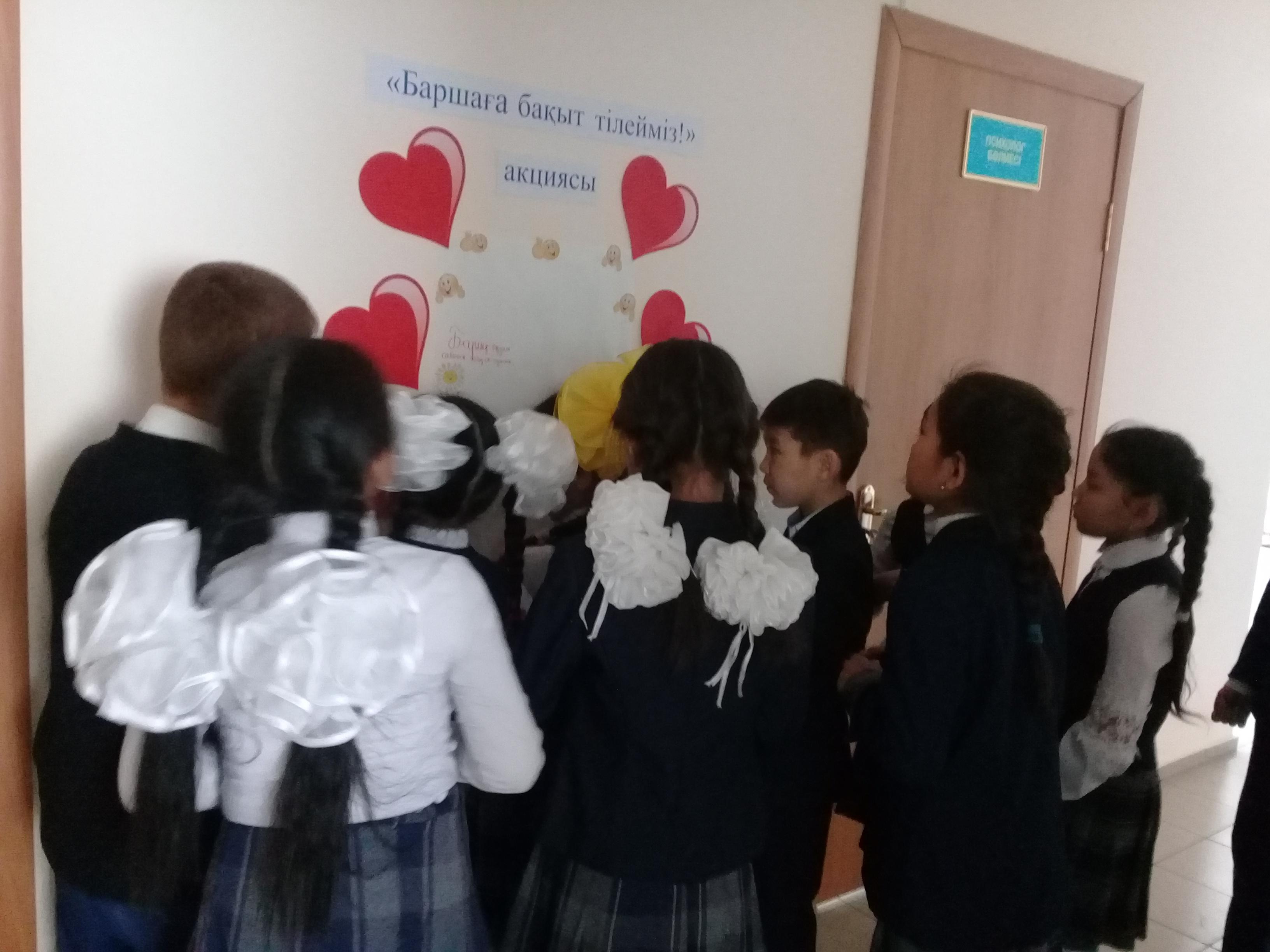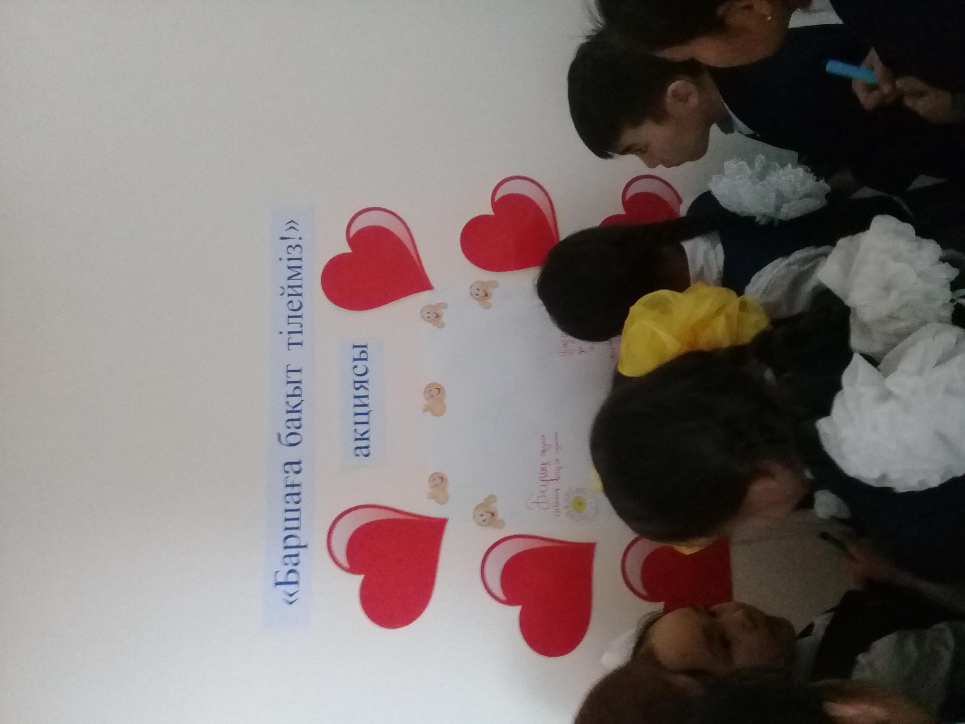 12 ақпан 2019 0 1 2 3 4 5 "Баршаға бақыт тілейміз!" акциясы 2019 жылдың 12 ақпан күні Ə.Молдағұлова атындағы шағын орталықты орта мектепте мектеп психологы: Г. Г.Жауғашеваның ұйымдастыруымен "Баршаға бақыт тілейміз!" деген тақырыпта мектеп оқушыларымен акция өткізілді.