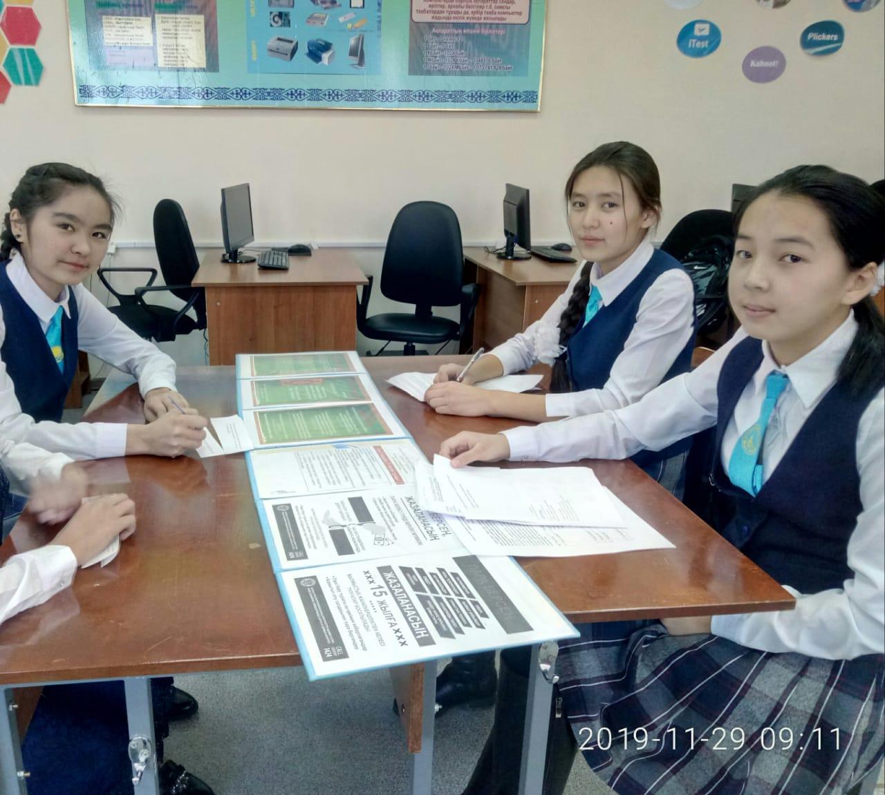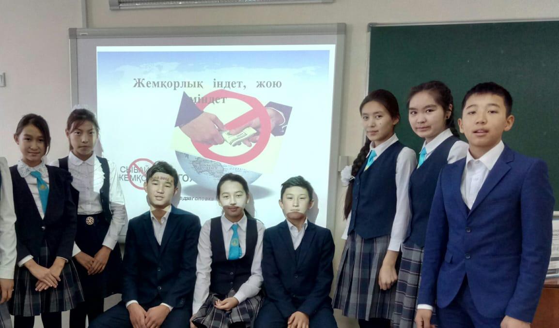 29 қараша 2019 0 1 2 3 4 5 Жемқорлыққа жол жоқ 2019 жылдың 29 қарашасы күні Әлия Молдағұлова атындағы шағын орталықты орта мектебінде "Жемқорлыққа жол жоқ" атты Жасұландықтар арасында сыныптан тыс іс-шара өтті.
