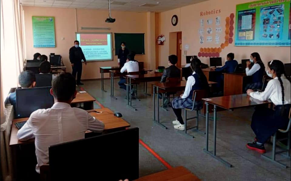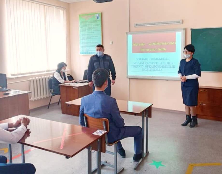 Ә.Молдағұлова атындағы шағын орталықты мектебінің психологы Жауғашева Гауһар Тасболатқызы, Шу АПБ - нің ЖПҚ - ның ювеналдық бөлімшесінің полиция капитаны Адашов Қалыбай Рыскулович жасөспірімдер арасында зорлық - зомбылықтың алдын алу мақсатында "Зорлық -зомбылықсыз балалық шақ" тақырыбында слайд көрсетіп, психопрофилактикалық жұмыс жүргізді.