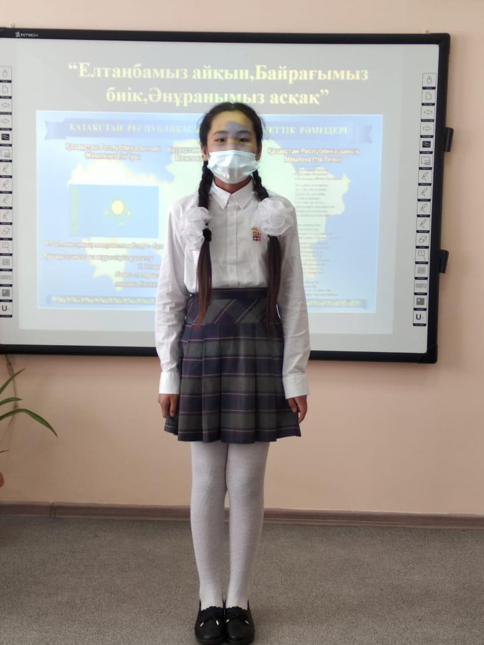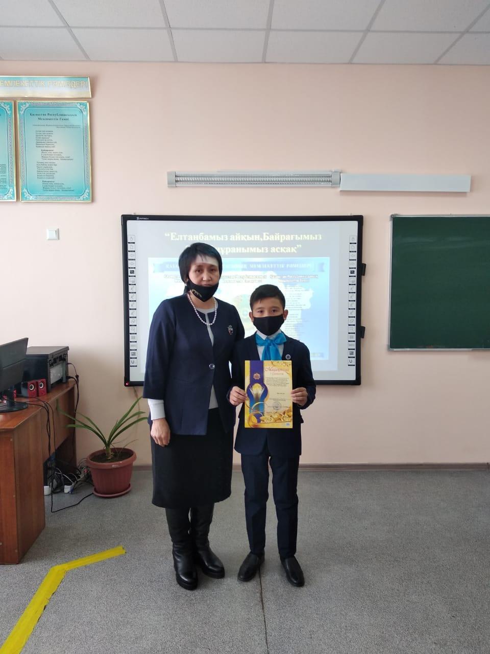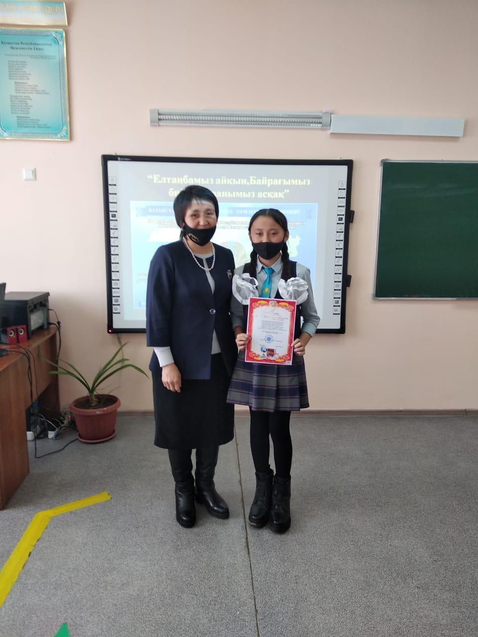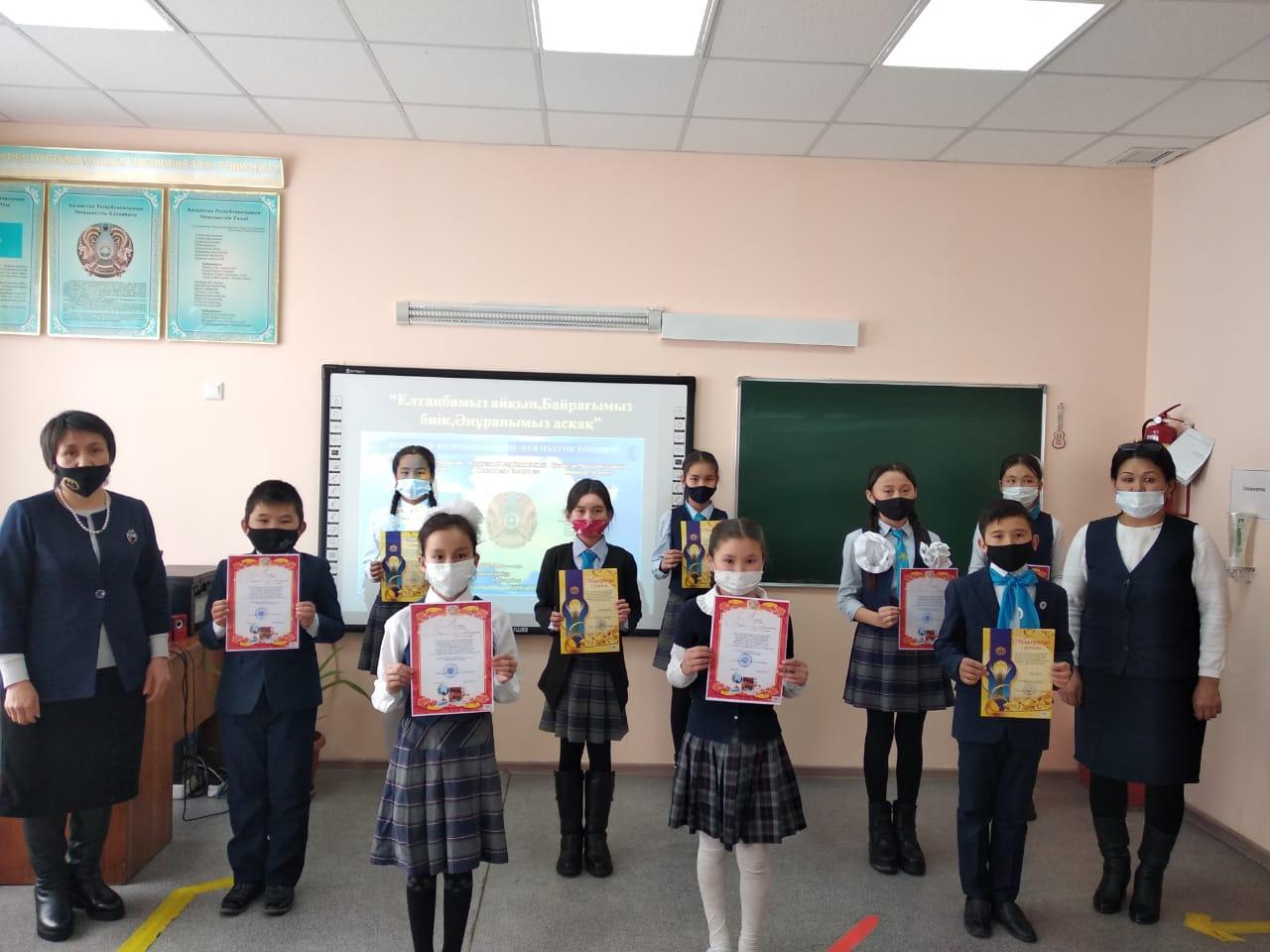 Мемлекеттік рәміздер-еліміздің егемендігі мен тәуелсіздігін паш ететін нышандар.Бұл рәміздер біздің мемлекетіміздің өткені,бүгіні мен болашағы арасындағы сабақтастықтың жарқын бейнесі.Осы мемлекеттік рәміздерді айшықтау мақсатында 4 – 7 сыныптар арасында «Елтаңбамыз айқын,Байрағымыз биік,Әнұранымыз асқақ» тақырыбында мәнерлеп оқу байқауы өткізіліп,5 сынып оқушылары Бестерекбай Дулат Бас жүлде, Нәдірбек Балым 1 орын,6 сынып оқушылары Нәдірбек Айсұлу 2 орын,Әбдіқадыр Жанерке 3 орынды иеленіп,мақтау қағаздарымен марапатталды.