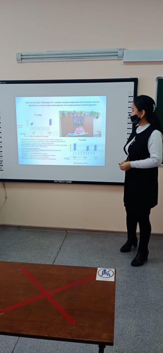 Пән мұғалімдері сынама тест нәтижелеріне талдау жасап, оқушылардың білім сапасын арттыру мақсатында өз тәжірибелерімен бөлісті. Мектеп психологы Г.Жауғашева қорытынды аттестаттау және ҰБТ-ге қатысатын оқушылармен жүргізілген сауалнама,тренинг қорытындысын баяндады. ШТАБ отырысында пән мұғалімдеріне оқу білім сапасын арттыру басты назарда болу керектігі айтылды.