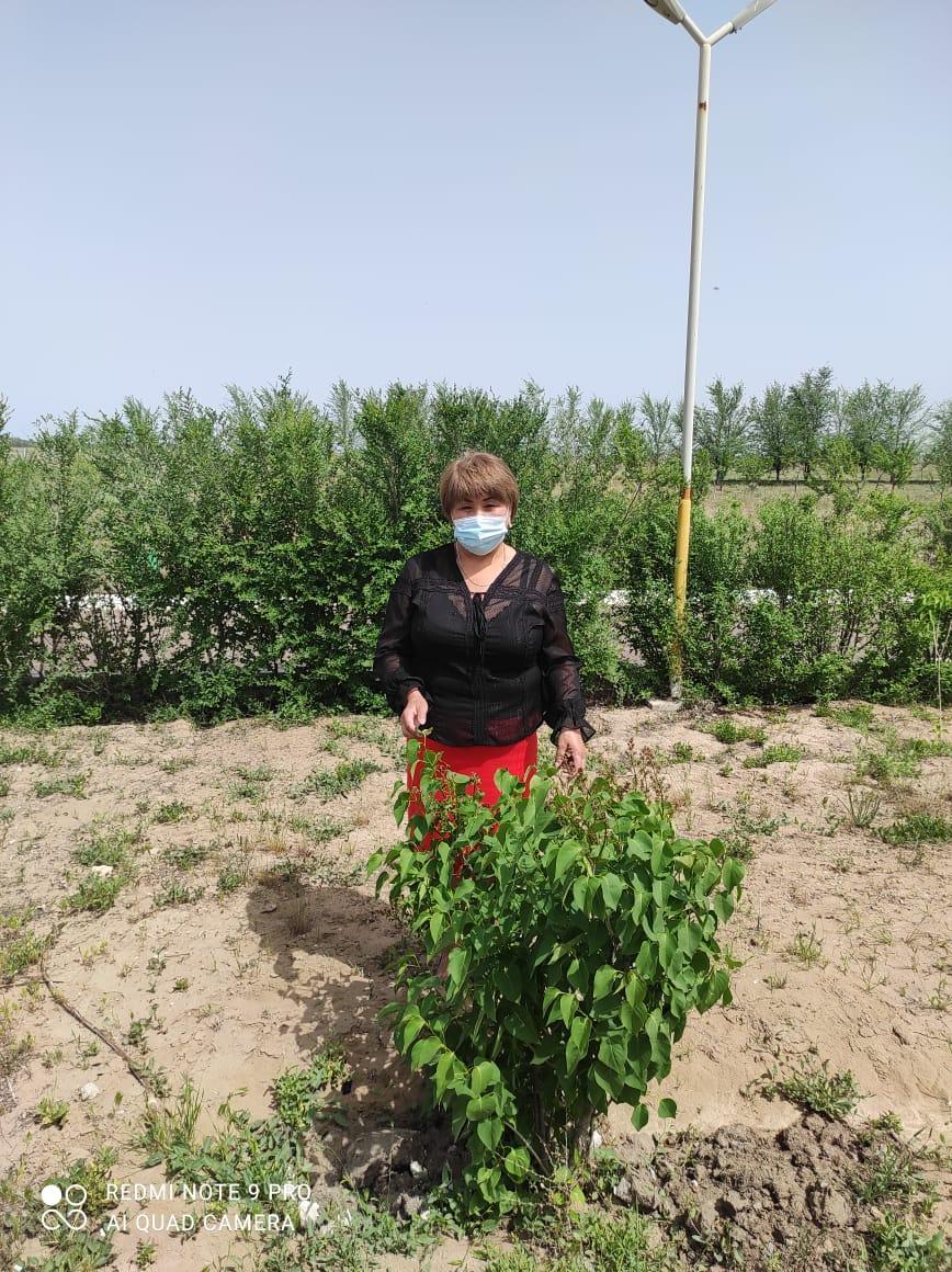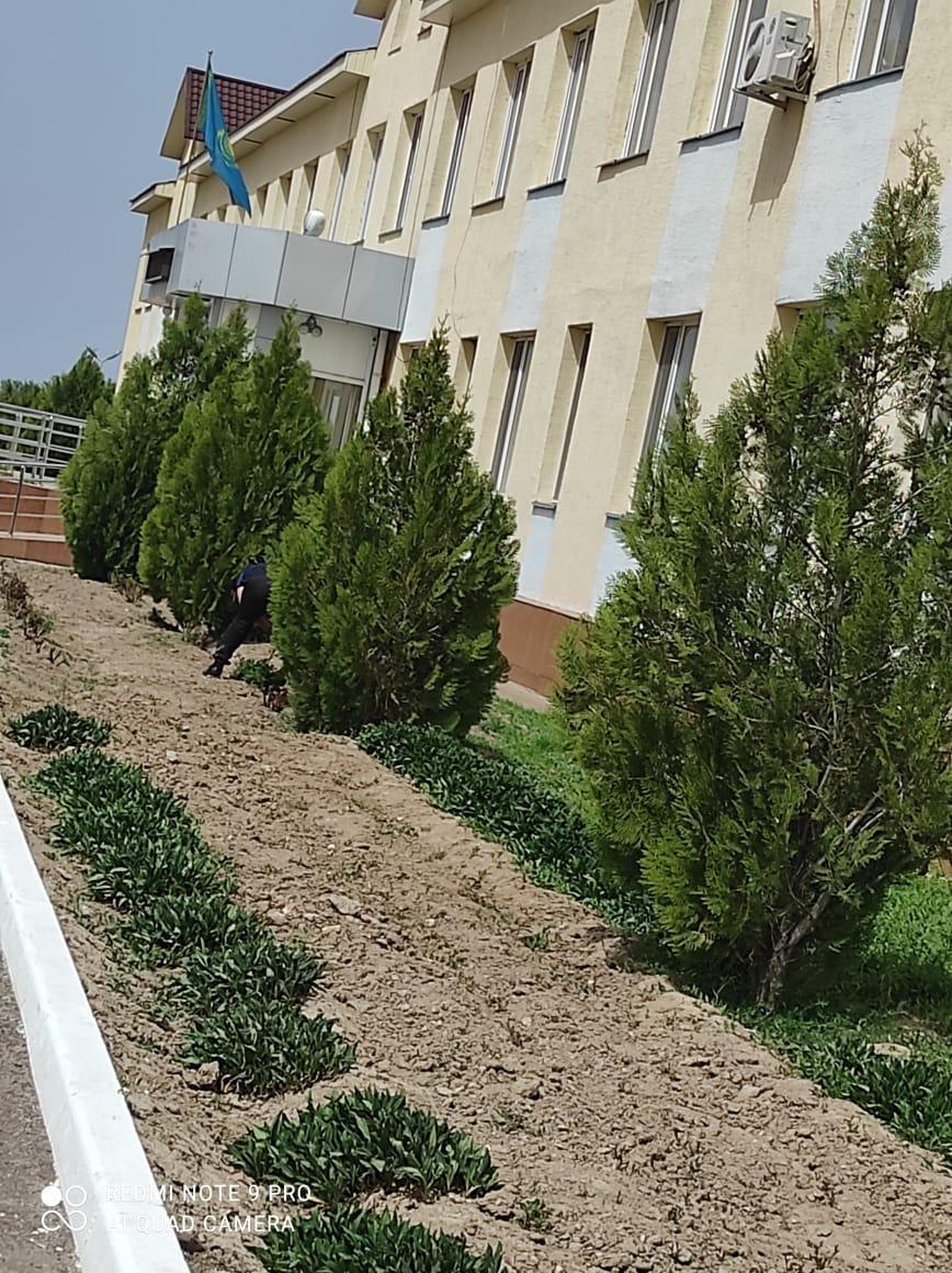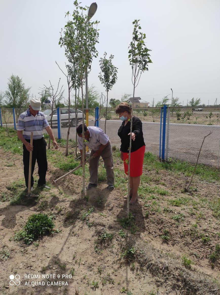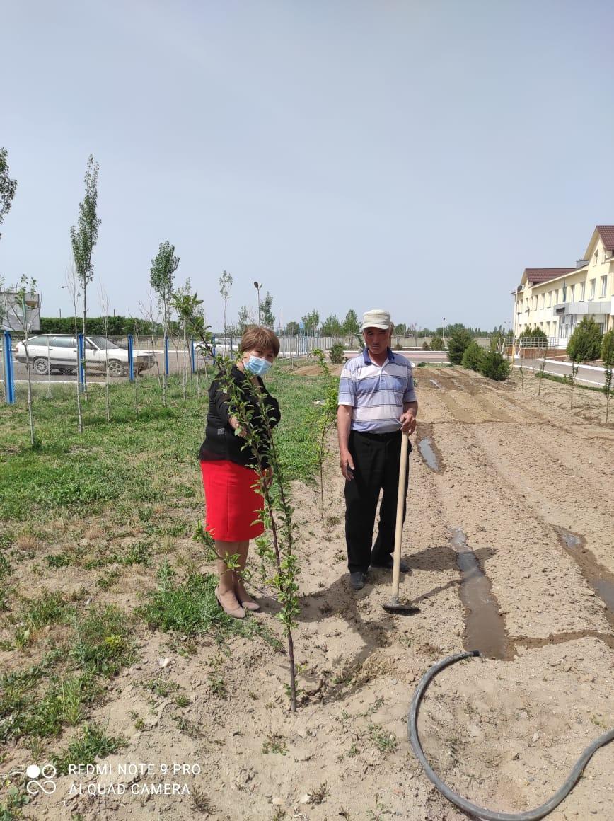 Мектебіміздің ауласында 100 жеміс ағашы, 25 сирень ағашы, 150 терек ағашы, 20 тұя ағашы, 3 шырша , 15 пальма ағашы, 60 катальфа ағашы, 500 түп қара ағаштары және 100 раушан гүлі, 20 сириский раушан гүлі, жылдық гүлдер т.б жайқалып өсіп тұр. Осы мектеп ауласының жасыл желекпен бөленіп тұруына бағбан Т.Бишалов пен кіші қызметкерлердің еңбегі зор.