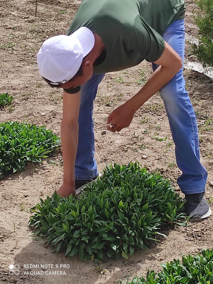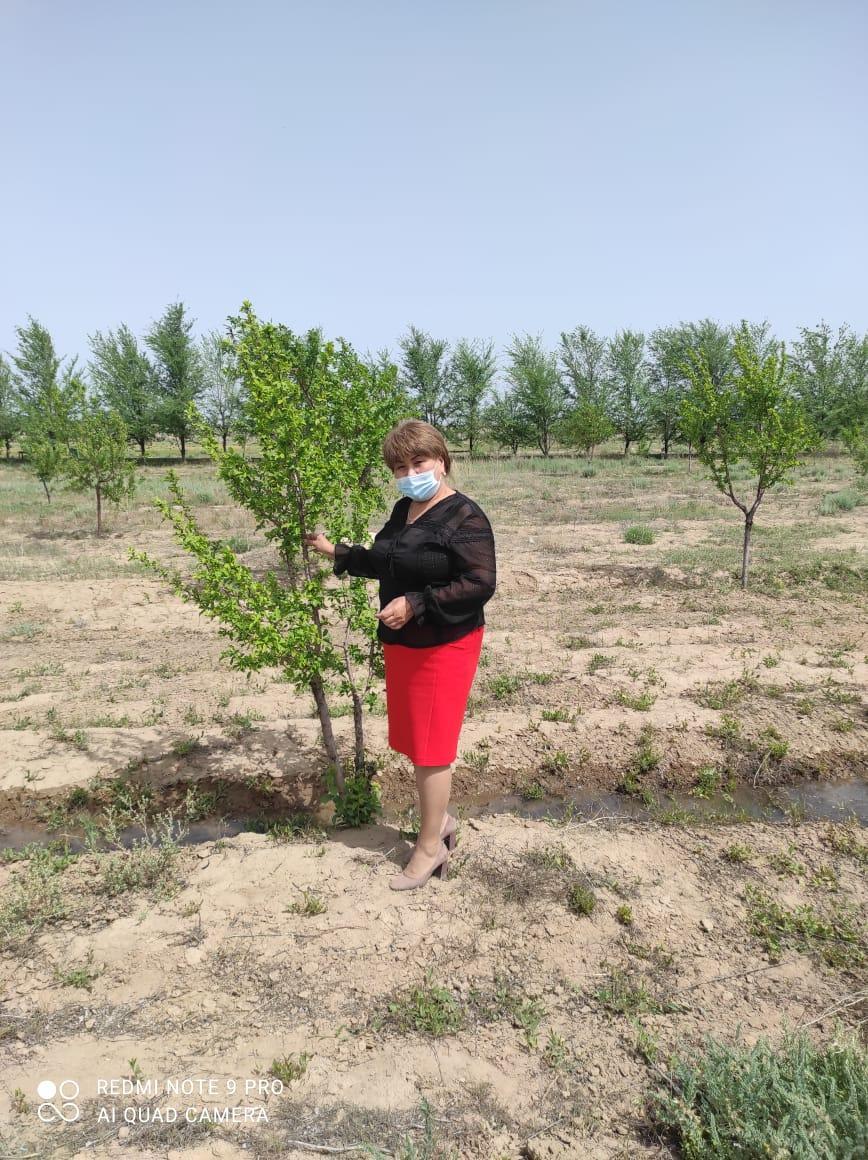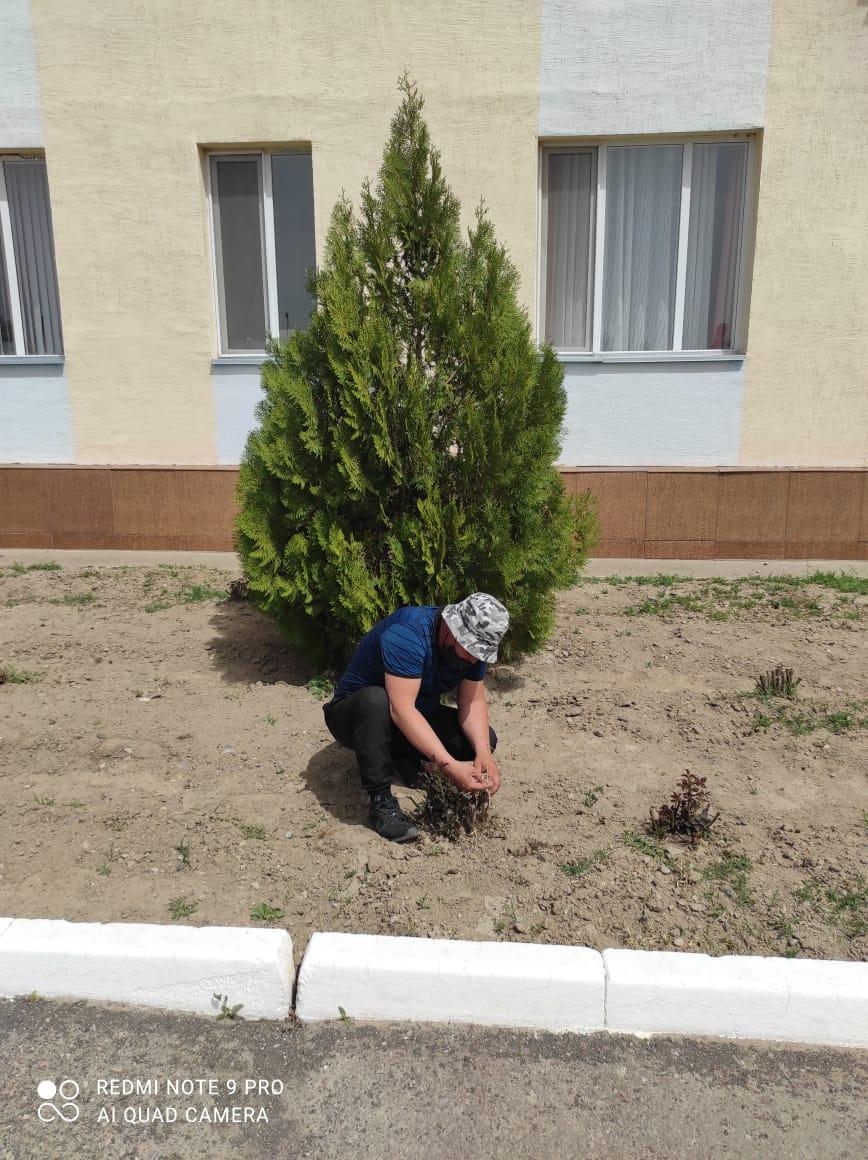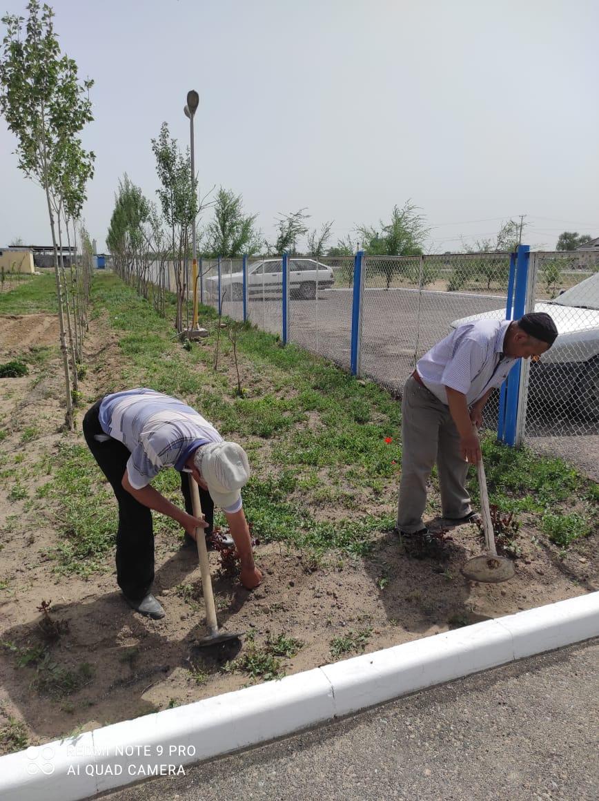 Мектебіміздің ауласында 100 жеміс ағашы, 25 сирень ағашы, 150 терек ағашы, 20 тұя ағашы, 3 шырша , 15 пальма ағашы, 60 катальфа ағашы, 500 түп қара ағаштары және 100 раушан гүлі, 20 сириский раушан гүлі, жылдық гүлдер т.б жайқалып өсіп тұр. Осы мектеп ауласының жасыл желекпен бөленіп тұруына бағбан Т.Бишалов пен кіші қызметкерлердің еңбегі зор.