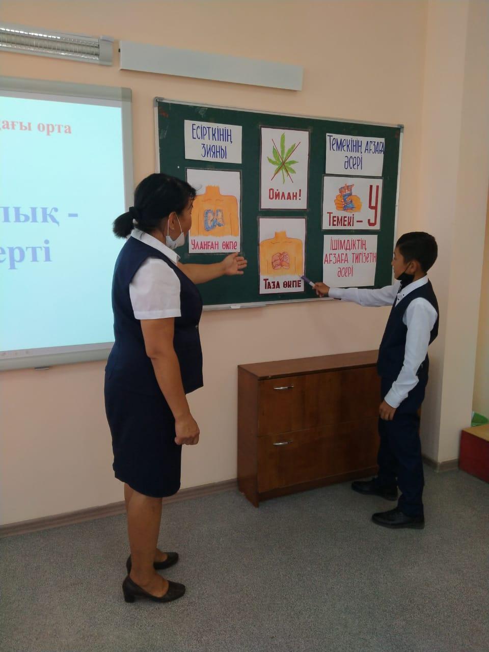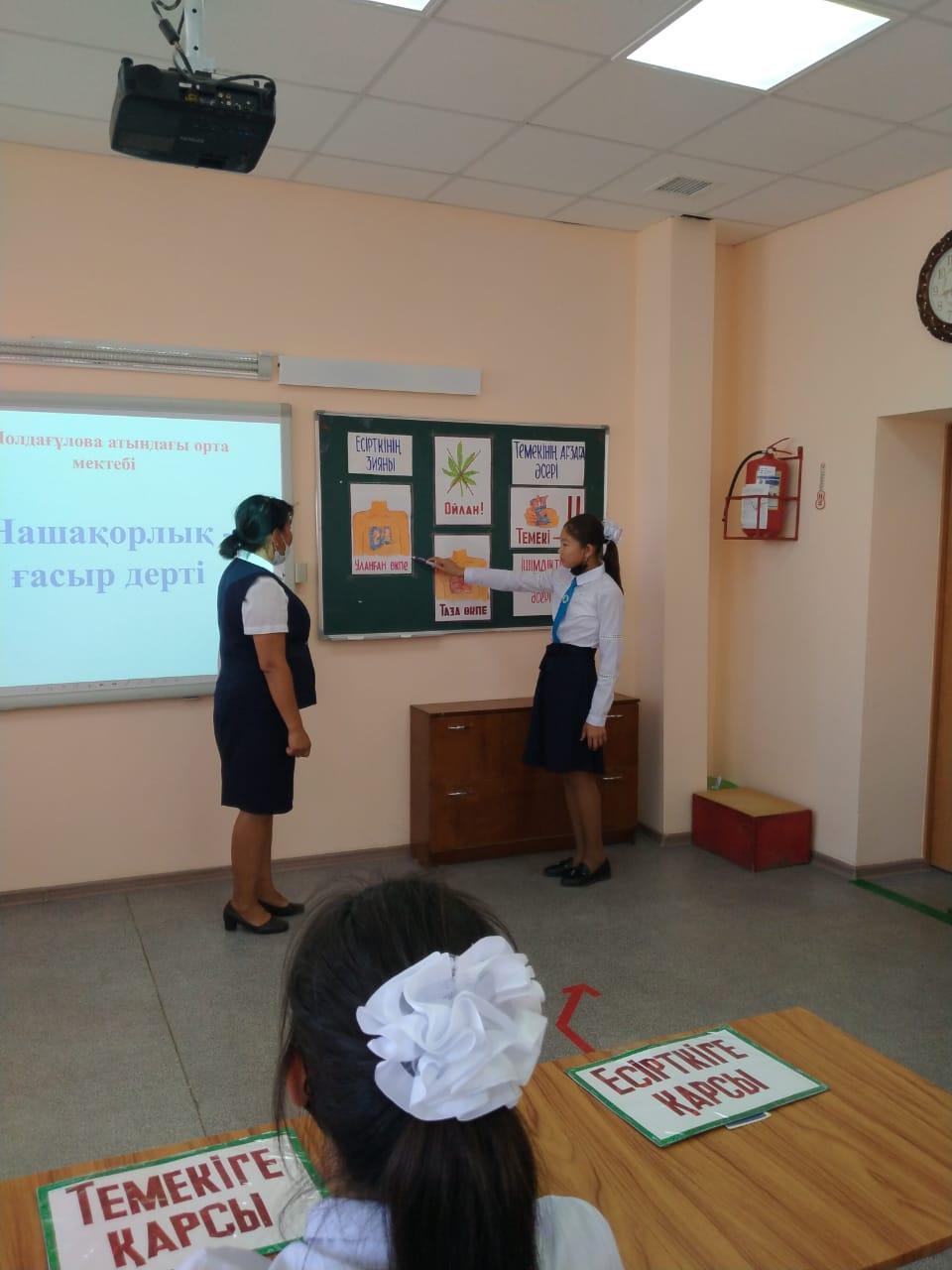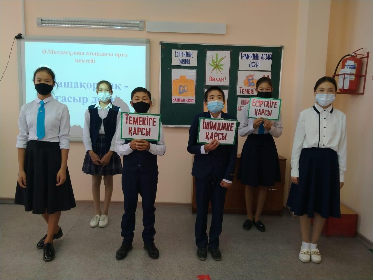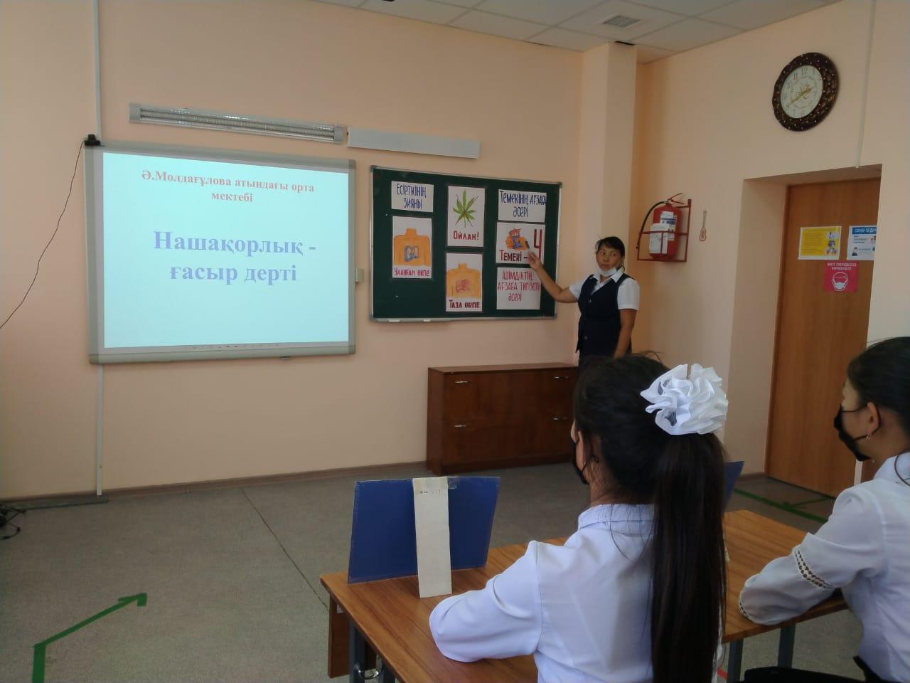 Әлия Молдағұлова атындағы орта мектебінде 13 қыркүйек күні «Есірткіге қарсы күрес» айлығы барысында оқушыларды зиянды әдеттерден аулақ болуға,салауатты өмір салтын сақтауға тәрбиелеу мақсатында 8 сынып жетекшісі Ж.Әуелбаева «Нашақорлық – ғасыр дерті» тақырыбында сынып сағатын өткізді.