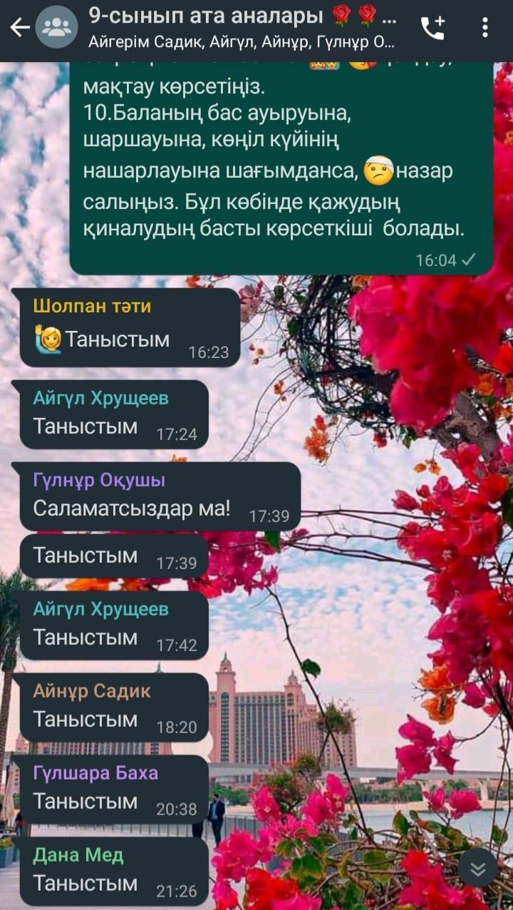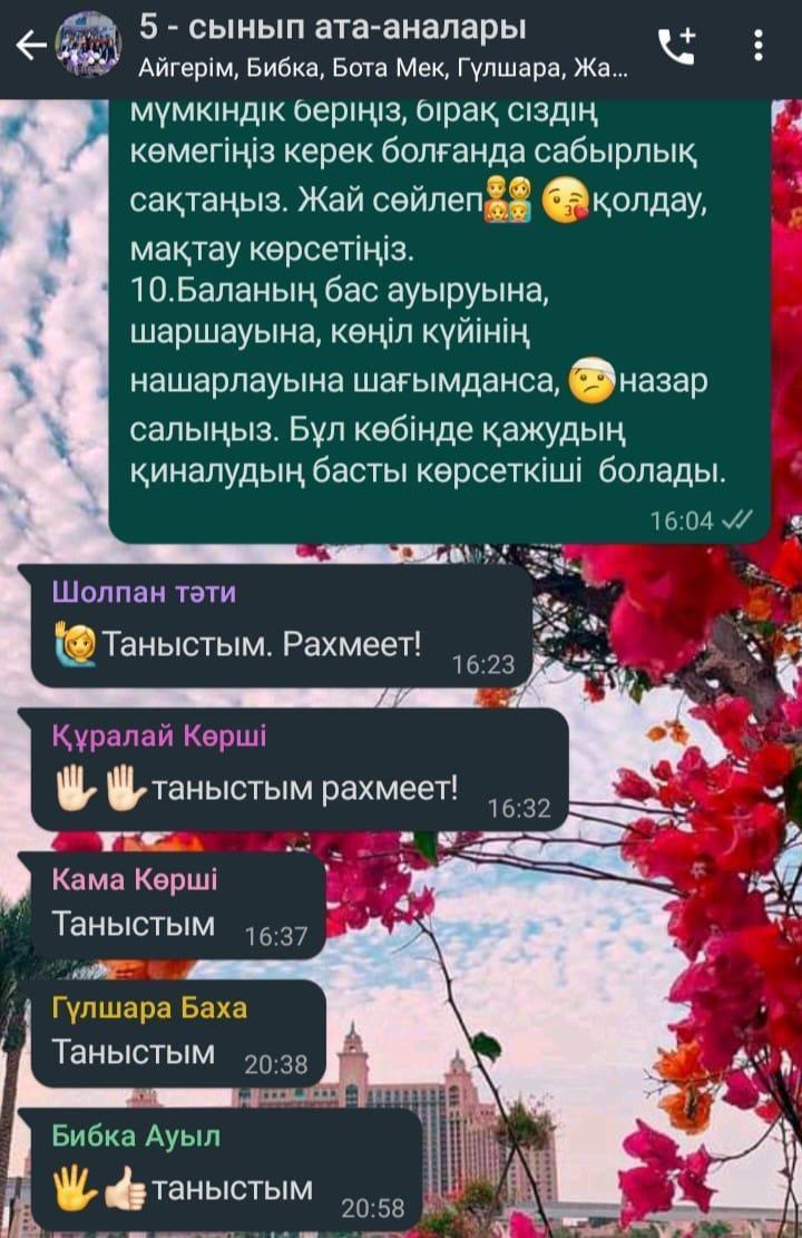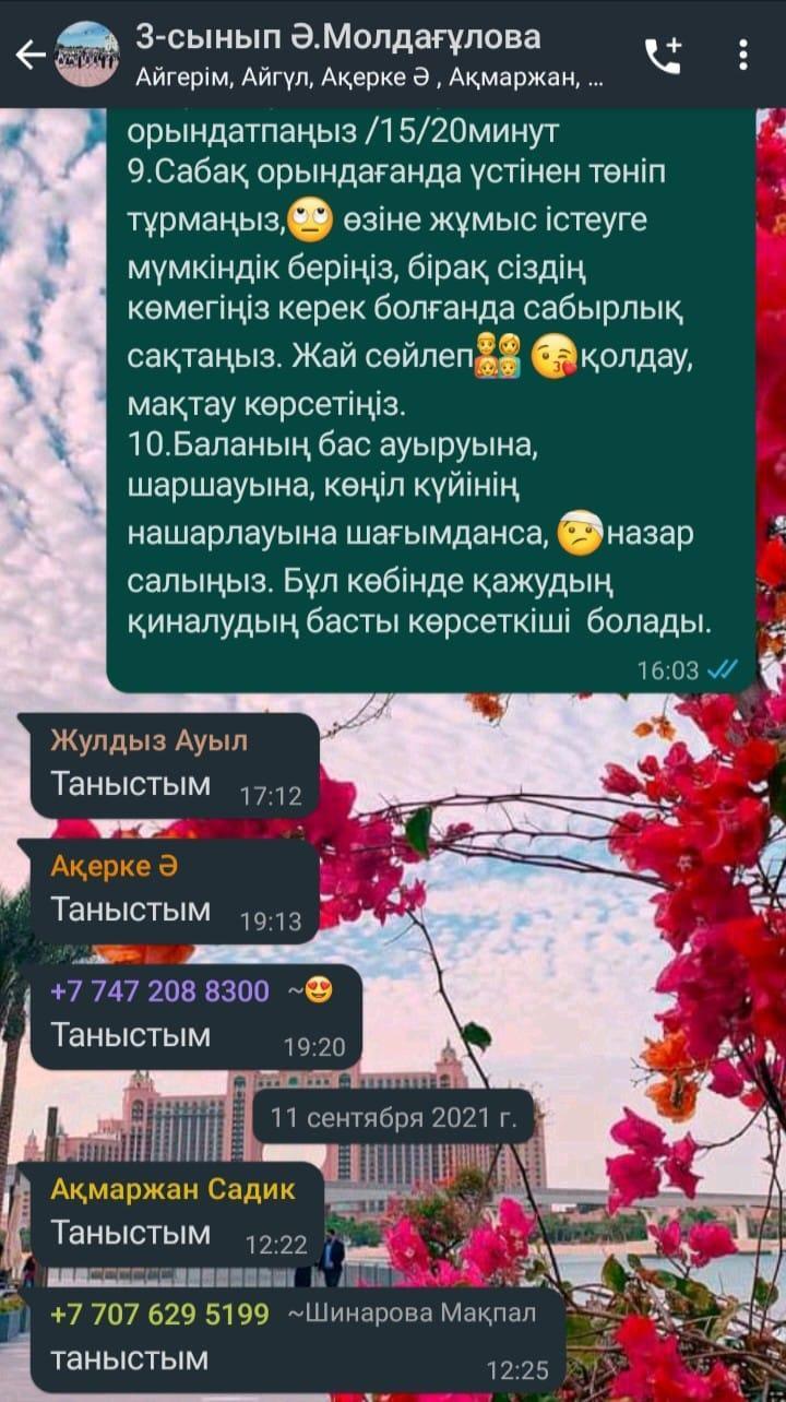 Әлия Молдағұлова атындағы орта мектебінің психологы Жауғашева Гауһар Тасболатқызы оқушылардың жаңа оқу жылында бейімделуіне оқуға психологиялық дайындығына көмек көрсету мақсатында ата-аналарға "Баланы оқытуға ата-ананың рөлі және психологиялық қолдау" деген тақырыпта ватцап желісі арқылы кеңес беріп, психоконсультациялық бағыт бойынша жұмыс жүргізді.