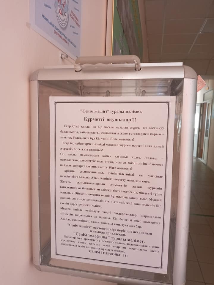 Әлия Молдағұлова атындағы орта мектебінің директордың тәрбие ісі-жөніндегі орынбасары: Ш.С.Илкибаева, педагог- психолог: Жауғашева Гауһар Тасболатқызы, әлеуметтік педагог: А.Кәдірбергенова бірлескен жоспарына сәйкес зорлық - зомбылықтың, құқық бұзушылық, жыныстық қол сұғылмаушылықтың алдын алу мақсатында мектептің 1- қабат дәлізінде "Сенім жәшіктері" мен "Сенім телефондарының" нөмірлері қыстырылып орналастырылған. Зорлық - зомбылықтың қандайда бір түріне тап болсаңыз көмек сұраудан қашпаңыз. Біз сіздерге қол ұшын созуға қашанда дайынбыз. Мектептің сенім телефоны 5-40-13.