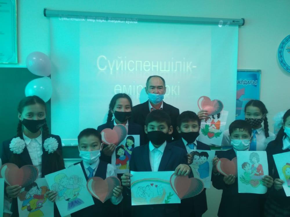 Әлия Молдағұлова атындағы орта мектебінде 22 қараша күні «Өзін – өзі тану» пәнінен 5 - 6 сыныптар арасында «Жалпы адамзаттық құндылықтар» күніне орай оқушыларды мейірімділікке,сүйіспеншілікке тәрбиелеу мақсатында «Сүйіспеншілік – өмір көркі» тақырыбында сынып сағаттары өткізілді.