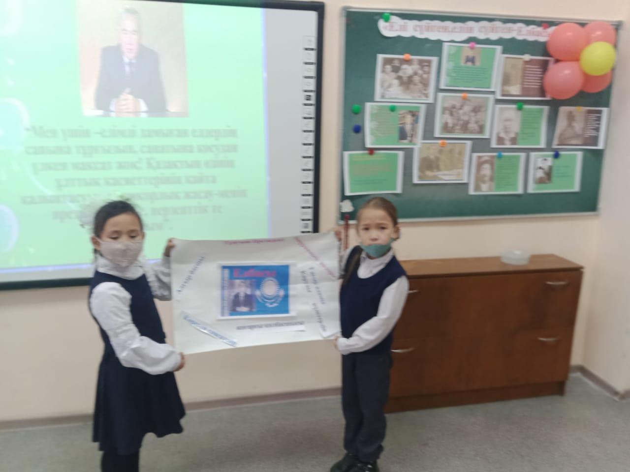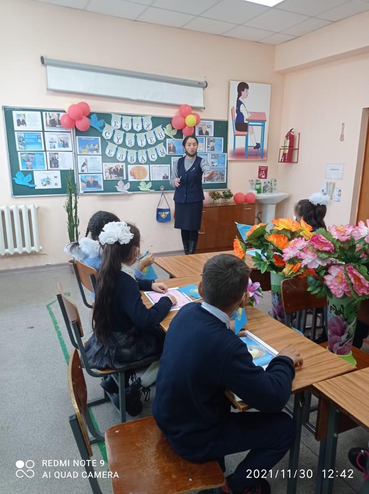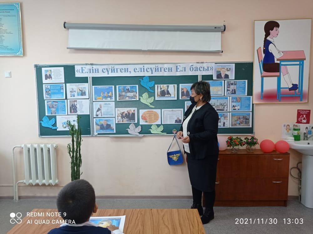 Әлия Молдағұлова атындағы орта мектебінде Қазақстан Республикасының Тәуелсіздігіне- 30 жыл толуына және 1 желтоқсан Президент күніне орай 1-4 сыныптар арасында "Елін сүйген , елі сүйген Елбасы" тақырыбында сынып сағаттары өткізілді.