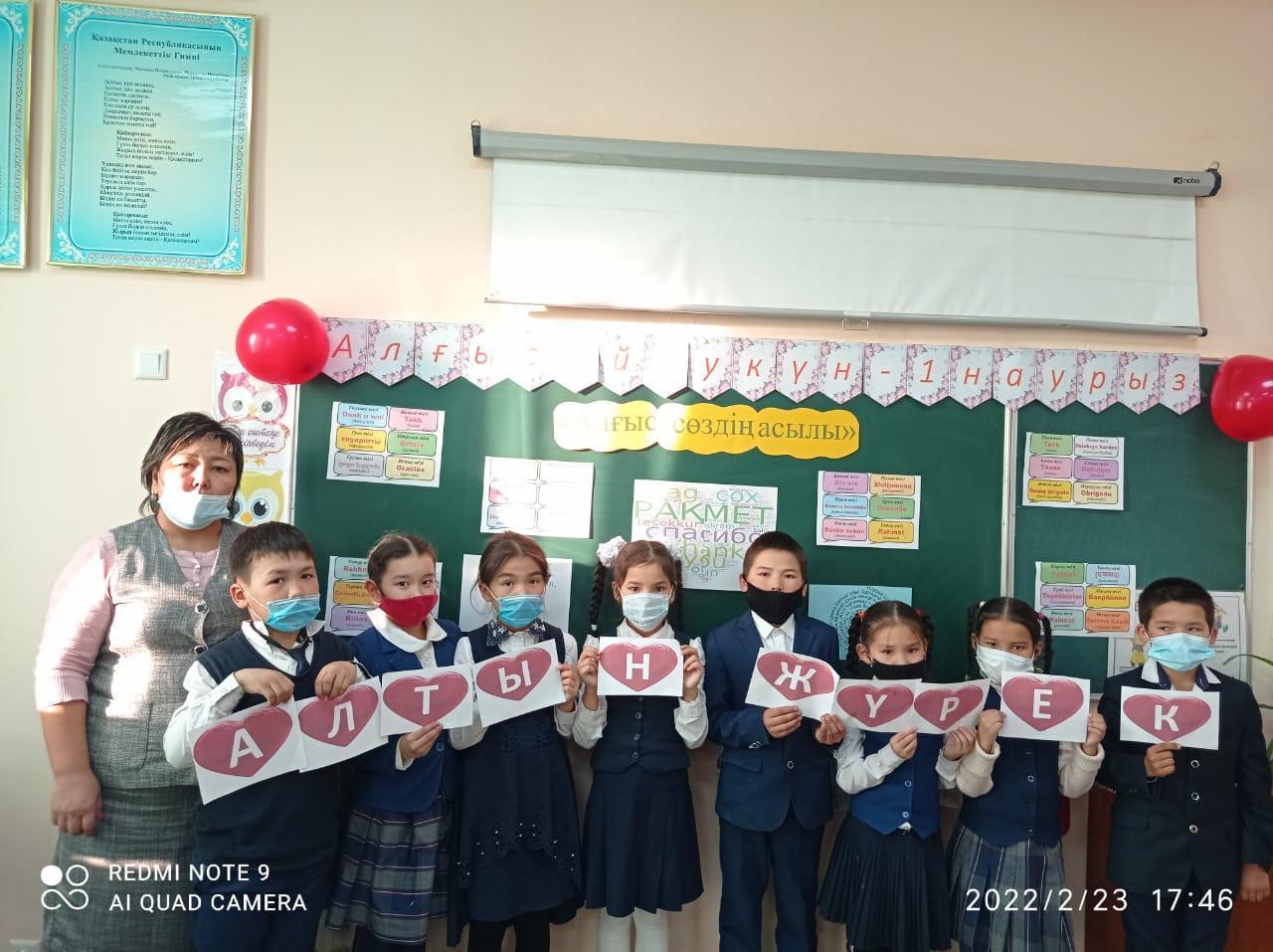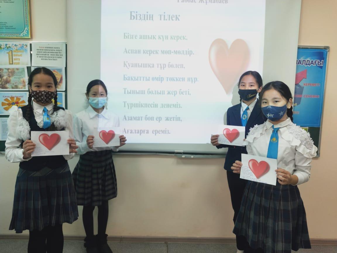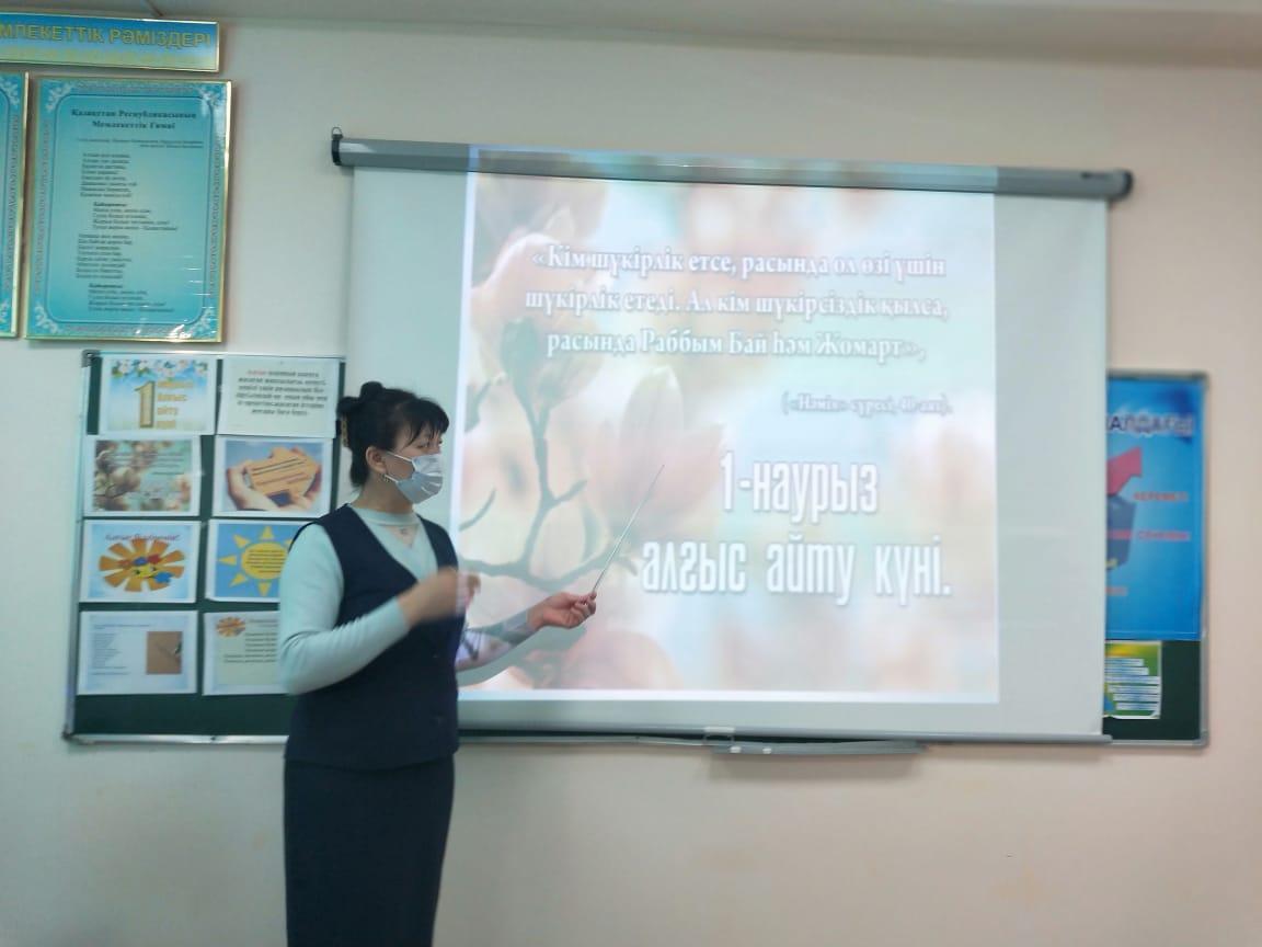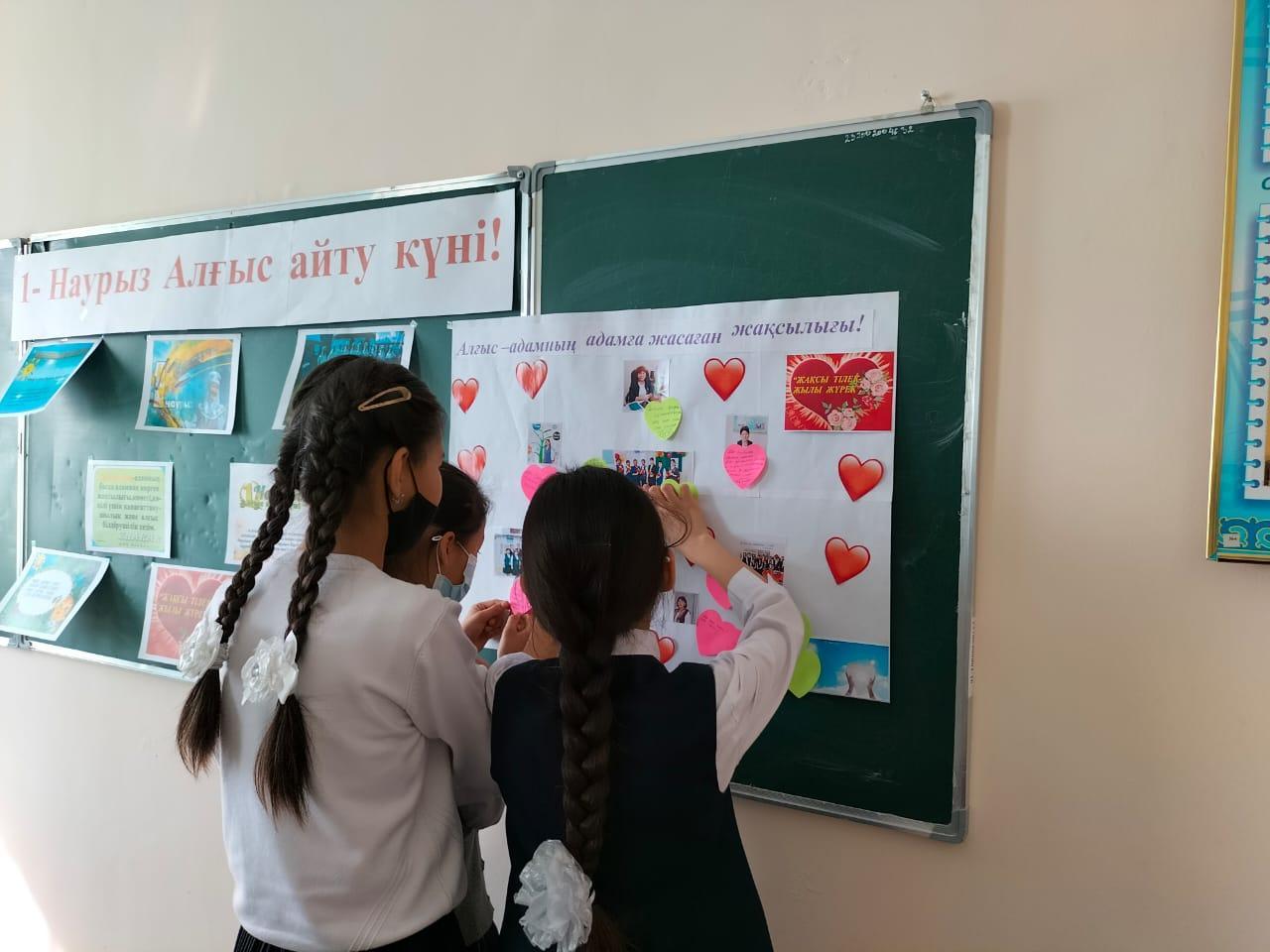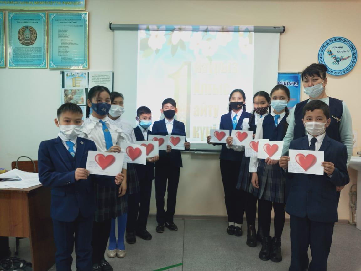 Әлия Молдағұлова атындағы орта мектебінде мектепішілік жоспарға сәйкес 1 наурыз Алғыс айту күніне орай оқушылардың отбасына,ата-аналарына,үлкен –кішіге деген сүйіспеншіліктерін,ризалық,рахмет,алғыс айту,сыпайылық қарым – қатынастарын дамыту мақсатында «Алғыс білдіру – ең асыл сөз!» тақырыбында 1 – 11 сыныптар арасында бірыңғай тәрбие сағаттары өткізілді.