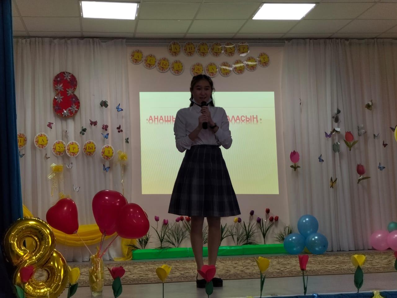 Әлия Молдағұлова атындағы орта мектебінде 8 наурыз Халықаралық әйелдер мерекесіне орай оқушылардың бойында әлемдегі асыл ананы сыйлауға,мейірімділікке,ана еңбегін қадірлей білуге тәрбиелеу мақсатында «Анашым,дархан даласың» тақырыбында мәнерлеп оқу байқауы өткізіліп, жеңімпаздар мақтау қағаздарымен марапатталды.