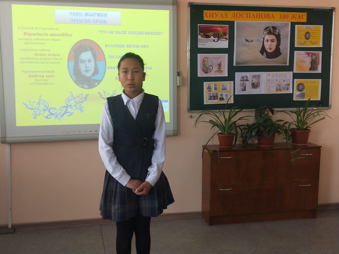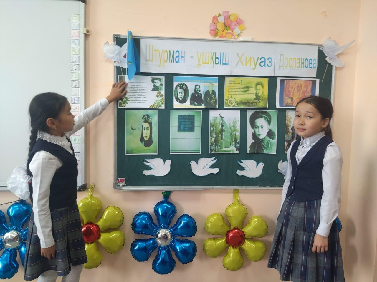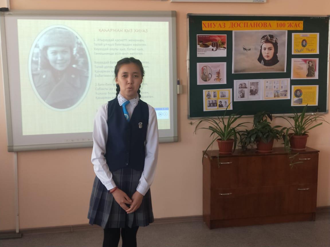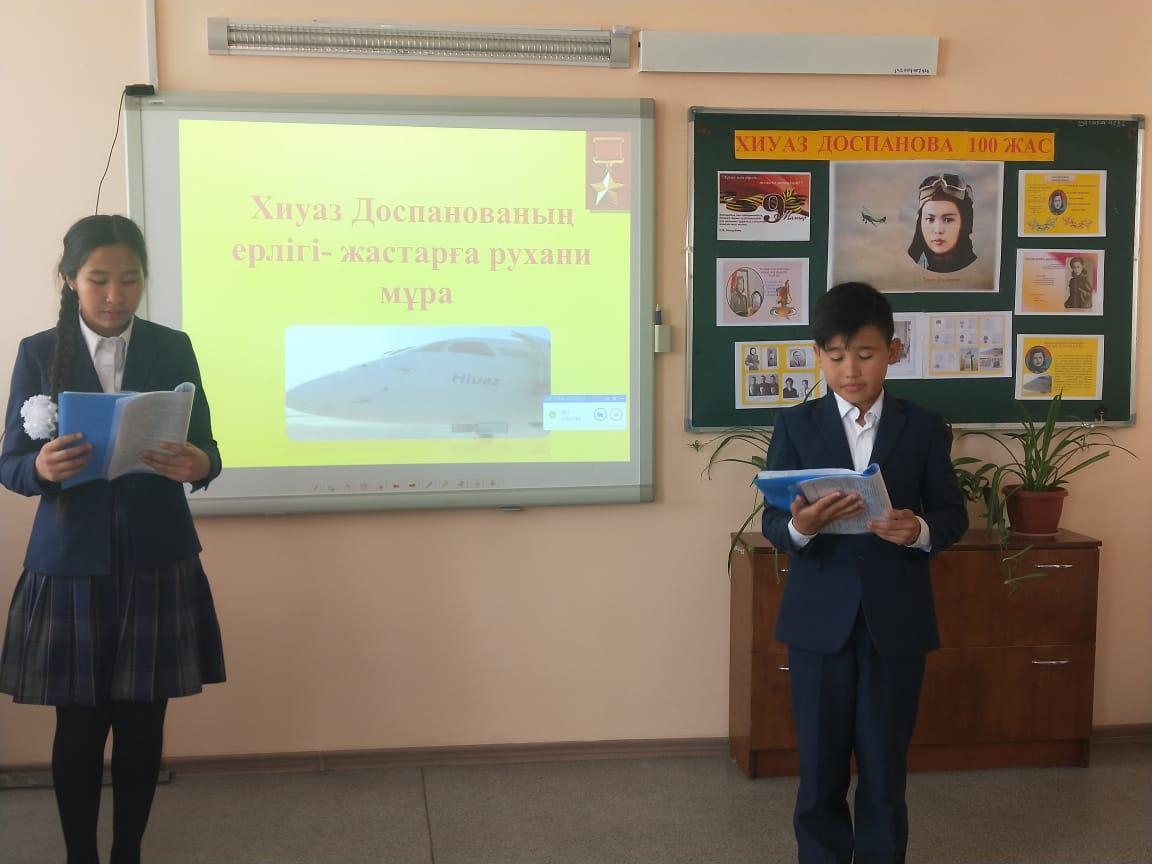 Әлия Молдағұлова атындағы орта мектебінде Хиуаз Доспанованың 100 жылдығына орай оқушыларға қазақ қыздарының Отан үшін жан қиярлық ерлік жолдарын үлгі ете отырып,отансүйгіштікке,адамгершілікке тәрбиелеу мақсатында 4 - 6 сынып жетекшілері «Штурман – ұшқыш Хиуаз Доспанова» , «Х.Доспанованың ерлігі – жастарға рухани мұра» тақырыптарында сынып сағаттарын өткізді.