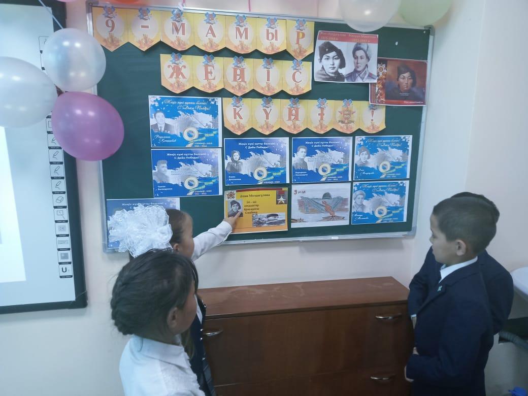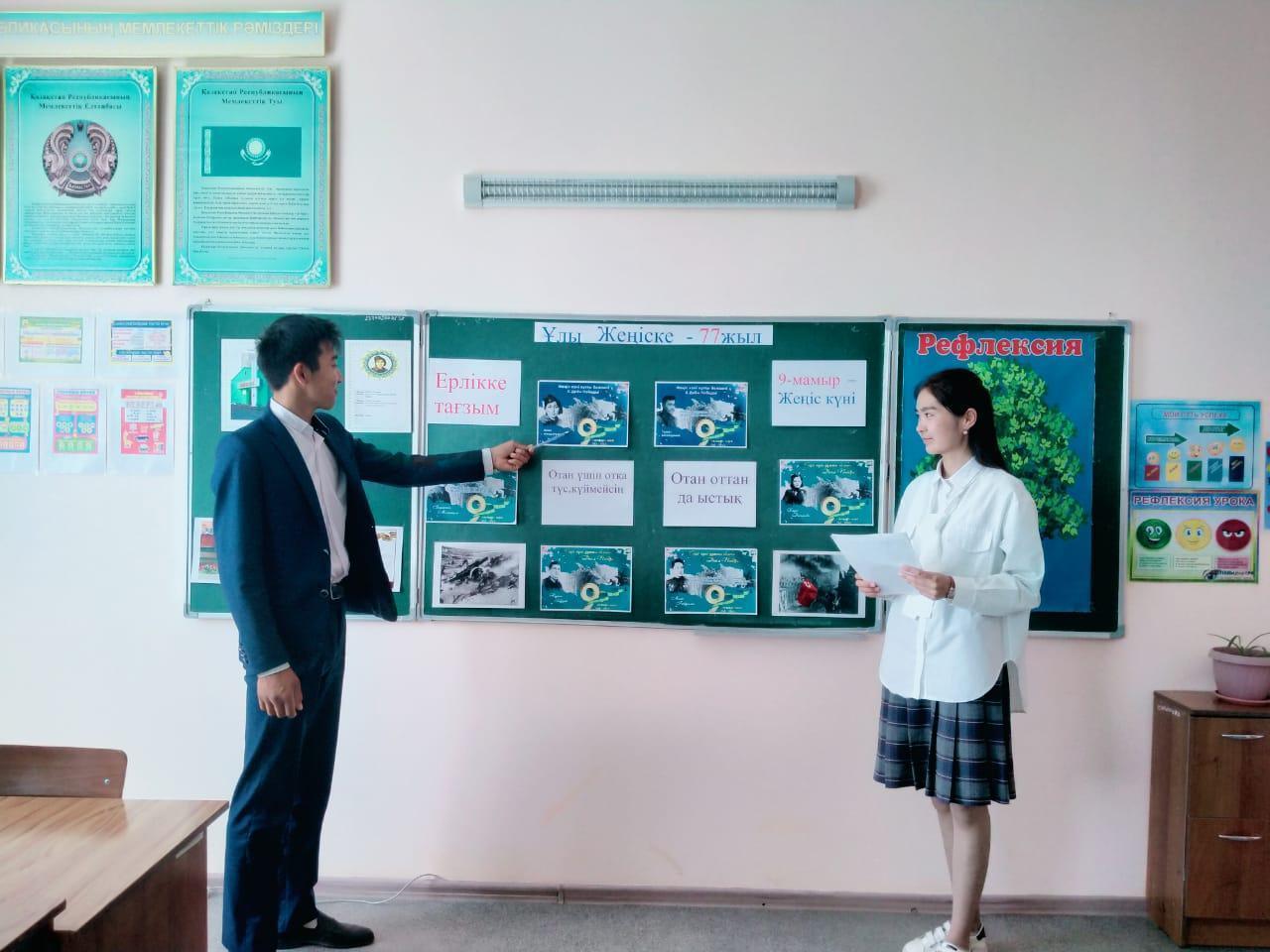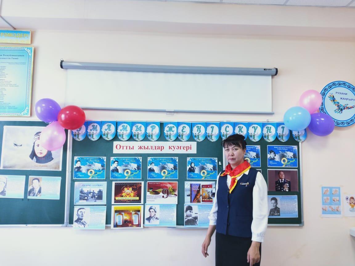 Әлия Молдағұлова атындағы орта мектебінде 7 мамыр Отан қорғаушылар күні мен 9 мамыр Ұлы Жеңіс күніне орай оқушыларды Отан сүйгіштікке,елін,жерін мақтан етуге,ұлтжандылыққа тәрбиелеу мақсатында 1 – 11 сыныптар арасында «Отты жылдар куәгері» , «Ерлікке тағзым» тақырыптарында сынып сағаттары өткізілді.
