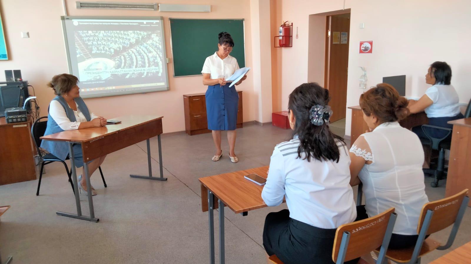 1 қыркүйек Мемлекет басшысы Қасым-Жомарт Тоқаевтың Қазақстан халқына кезекті жолдауын Әлия Молдағұлова атындағы орта мектебінің педагогтары тындады.