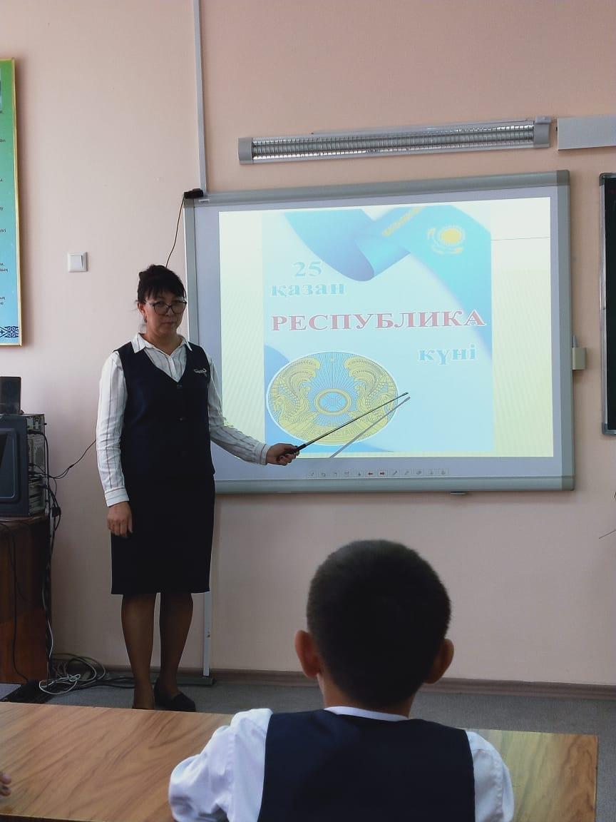 Ә. Молдағұлова атындағы орта мектебінде 25 қазан Республика күніне орай жас ұрпақты Отанын сүюге, елімізді, туған жерді қорғай білуге, ұлтжандылыққа, патриоттық сезімге тәрбиелеу мақсатында 1-11 сыныптар арасында "Менің Отаным - Қазақстан " тақырыбында сынып сағаттары өткізілді.
