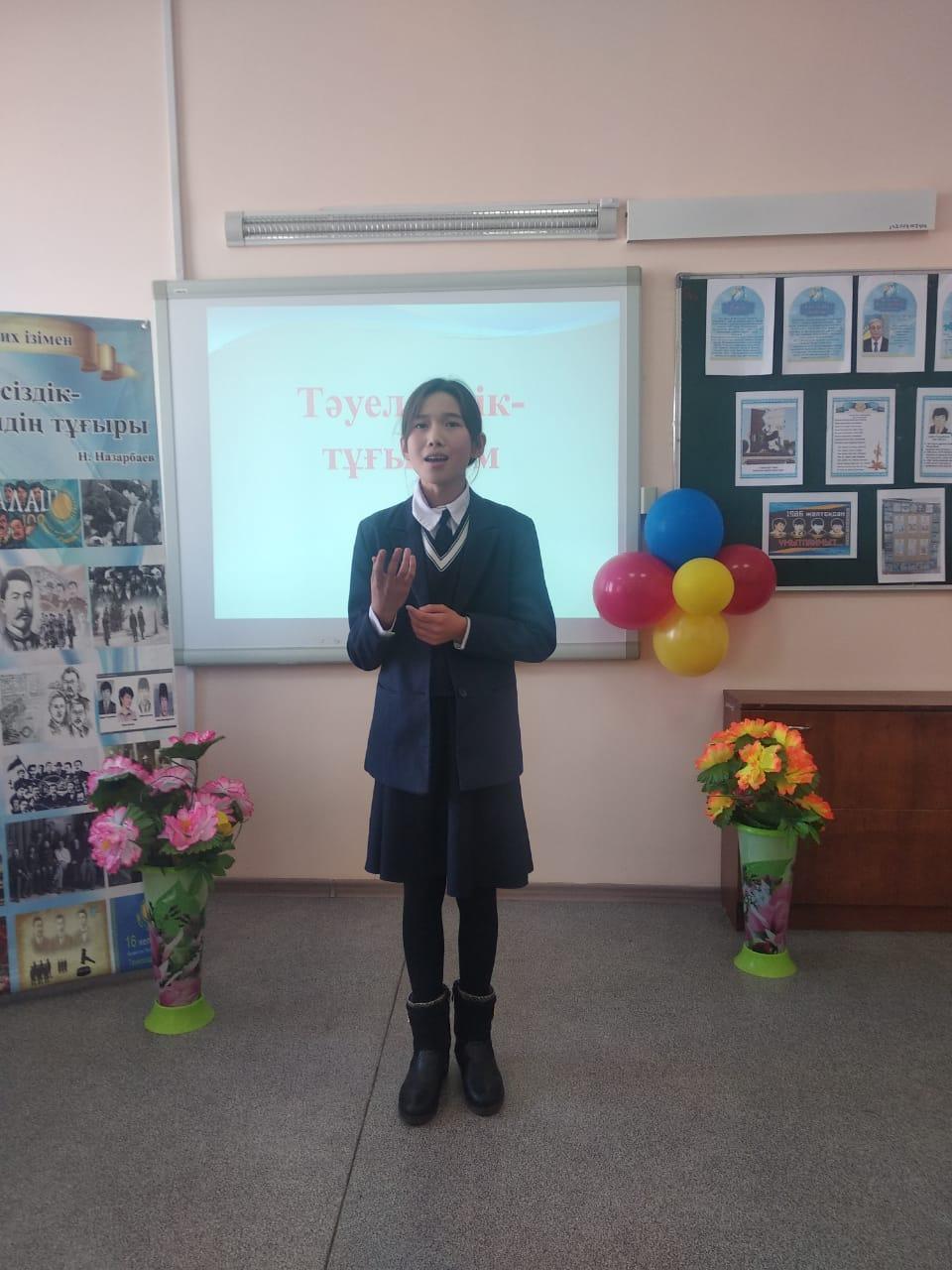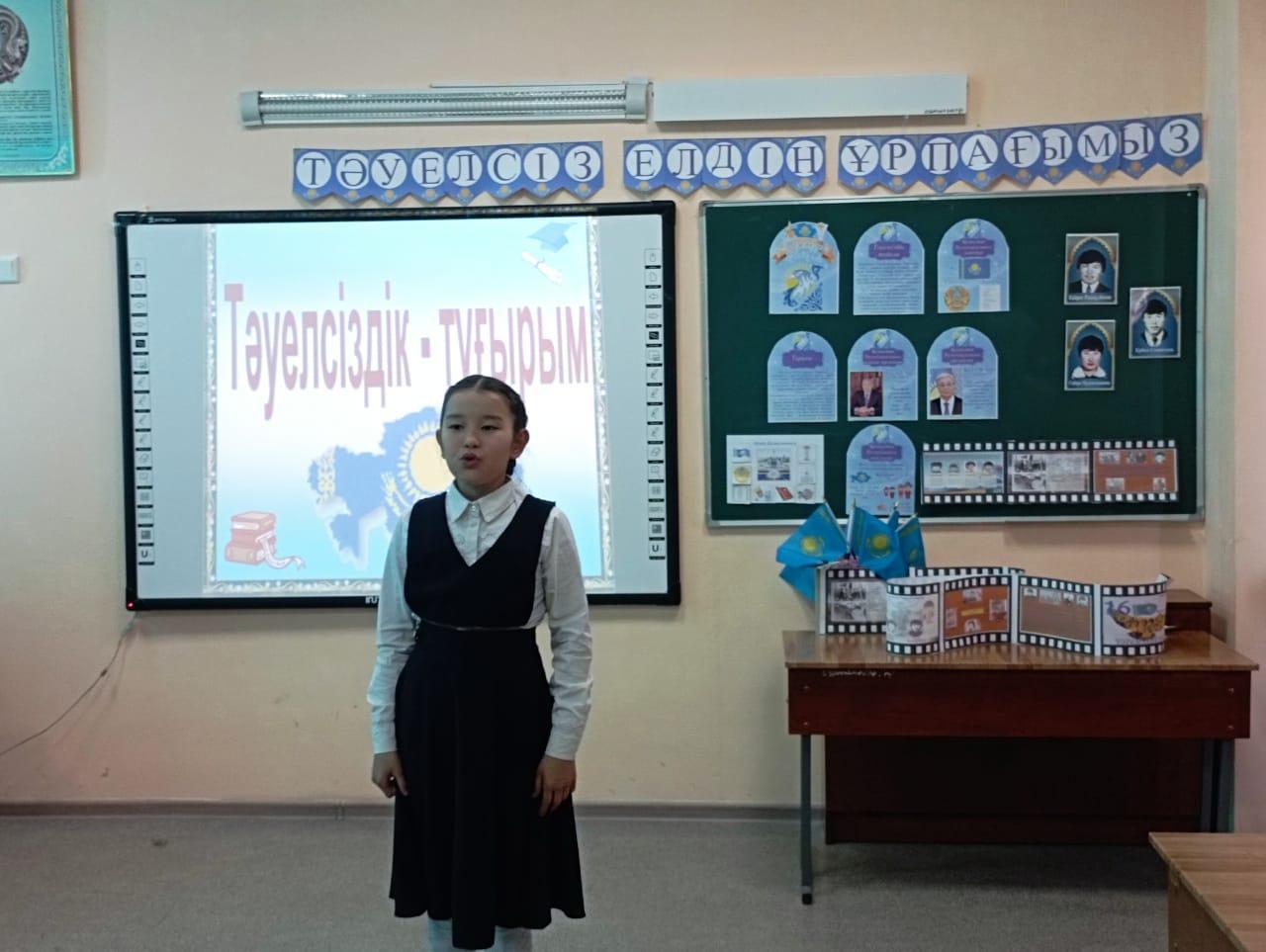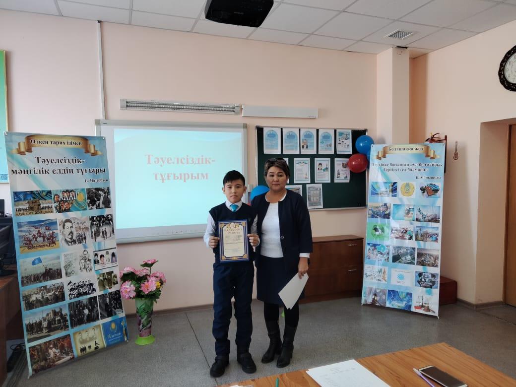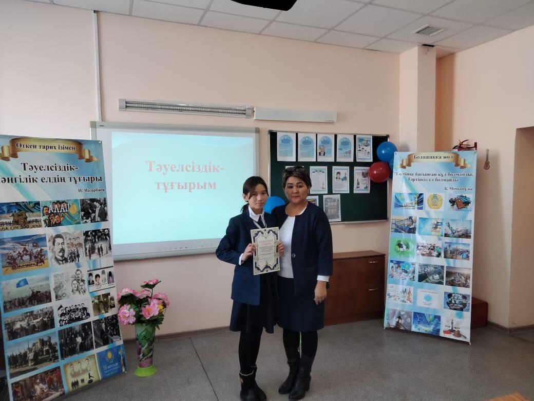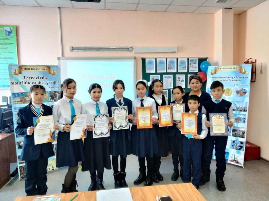 Әлия Молдағұлова атындағы орта мектебінде 16 – желтоқсан Қазақстан Республикасы Тәуелсіздік күні мерекесіне орай оқушыларды ата – бабамыздың тәуелсіздік жолындағы ерлігін үлгі етіп,өз Отанын сүюге,еліне,халқына қызмет етуге тәрбиелеу мақсатында «Тәуелсіздік - тұғырым» тақырыбында 2 – 8 сыныптар арасында мәнерлеп оқу байқауы ұйымдастырылып,нәтижесінде жеңімпаз оқушылар мақтау қағаздарымен марапатталды.