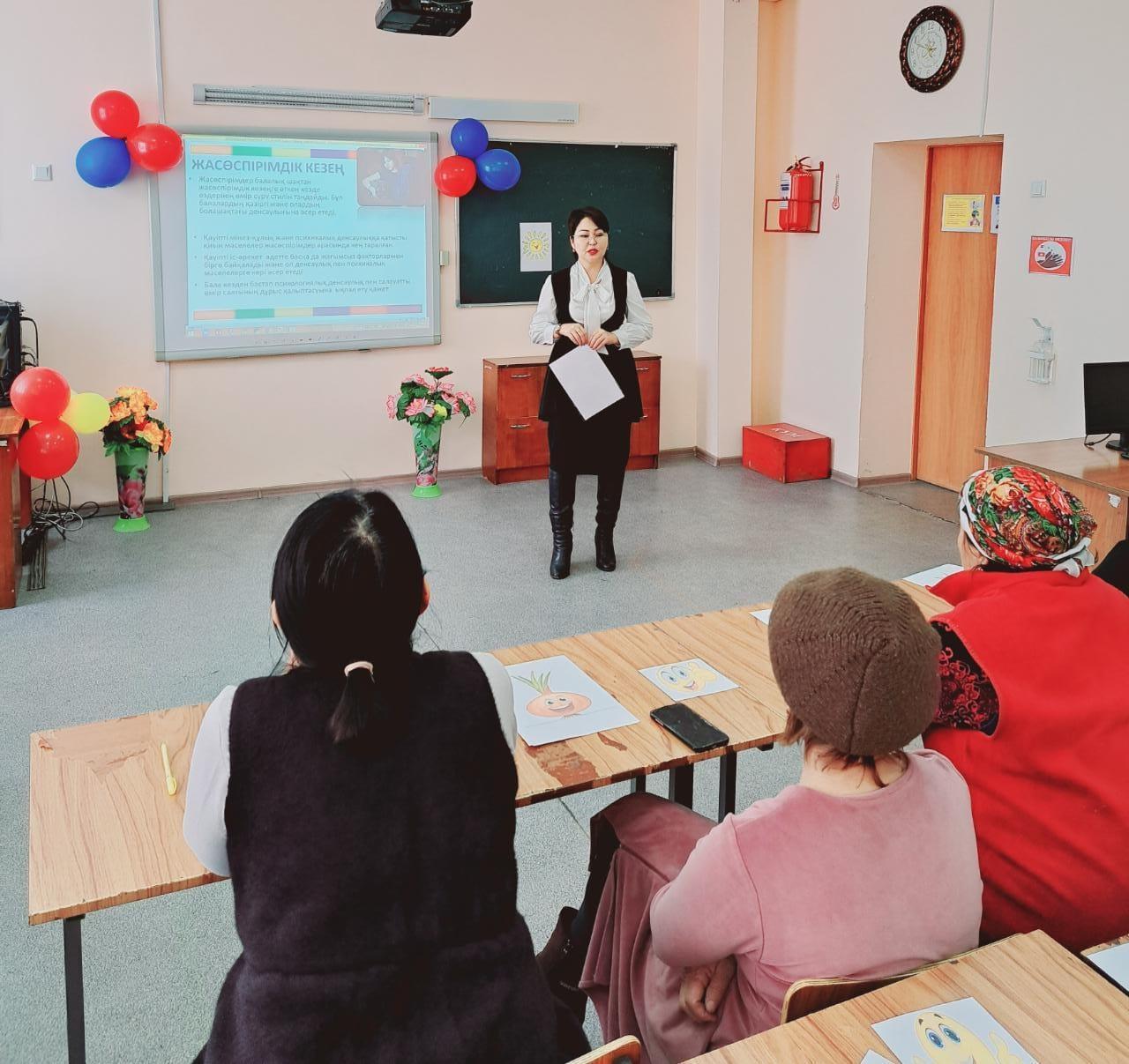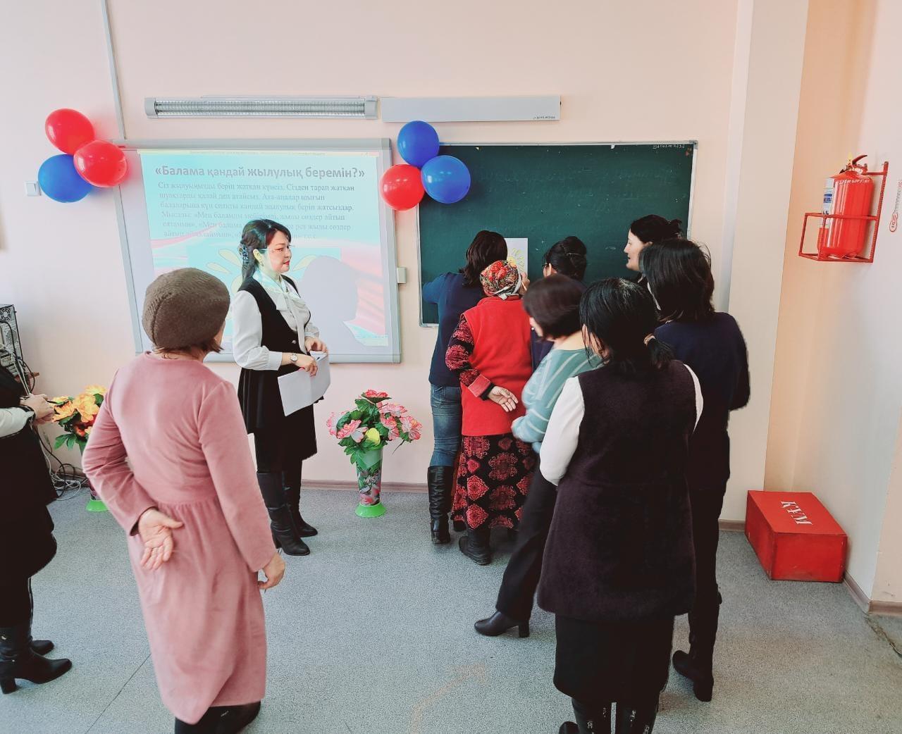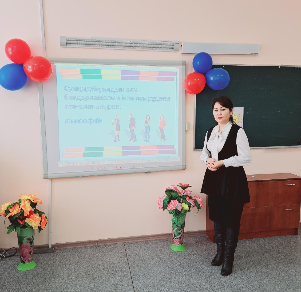 Әлия Молдағұлов атындағы орта мектебінің психологы Жауғашева Гауһар Тасболатқызы 8-9-10 сынып оқушыларының ата-аналарымен мектептегі жасөспірімдердің физикалық және психикалық денсаулығын нығайту және деструктивті мінез -құлықтың алдын алу мақстаныда "Суицидтің алдын алу бағдарламасын іске асырудағы ата-ананың рөлі" тақырыбында семинар өткізді. Семинар барысында ата-аналарға психикалық денсаулық туралы мағлұматтар айтып,бағдарламаның маңыздылығы мен өзектілігін түсіндіре отырып, бағдарлама аясында жүргізілетін жұмыс түрімен таныстырып өтті.Сонымен қатар оқушылардан сауалнама алу үшін ата-аналардың рұқсатын алып,келісім парағына таныстыру жұмысын жүргізді. Сондай ақ, "Жүрек жылуы" тақырыбында психологиялық тренинг өткізіп,кеңестер беріп өтті.