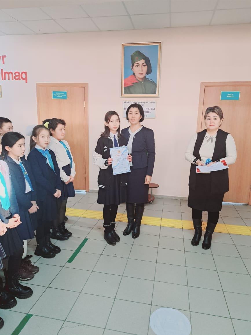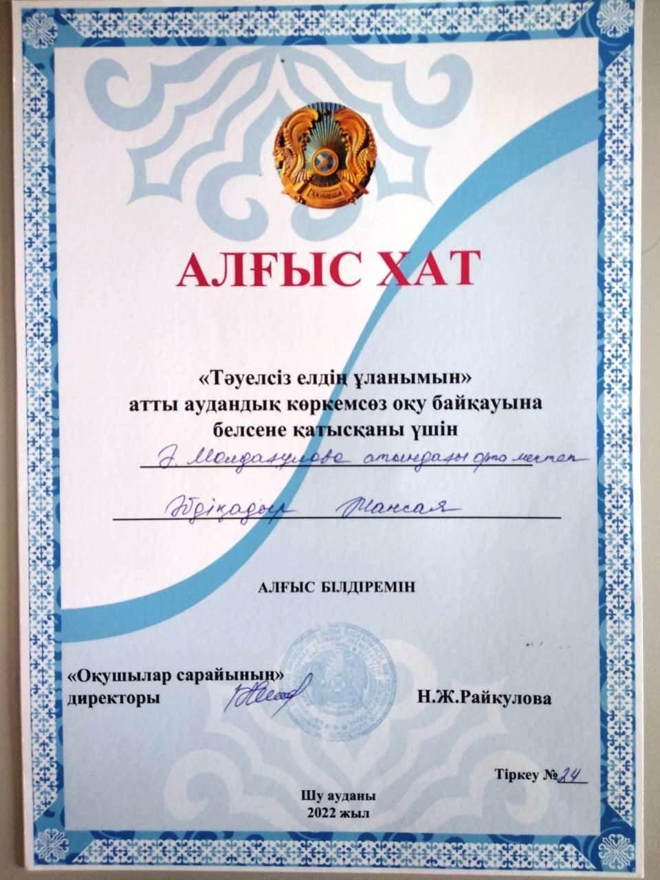 Әлия Молдағұлова атындағы орта мектебі 16 желтоқсан Тәуелсіздік күніне орай ұйымдастырылған аудандық «Тәуелсіз елдің ұланымын» атты көркемсөз оқу байқауына белсене қатысқаны үшін 8 сынып оқушысы Әбдіқадыр Жансая алғыс хатпен марапатталды.