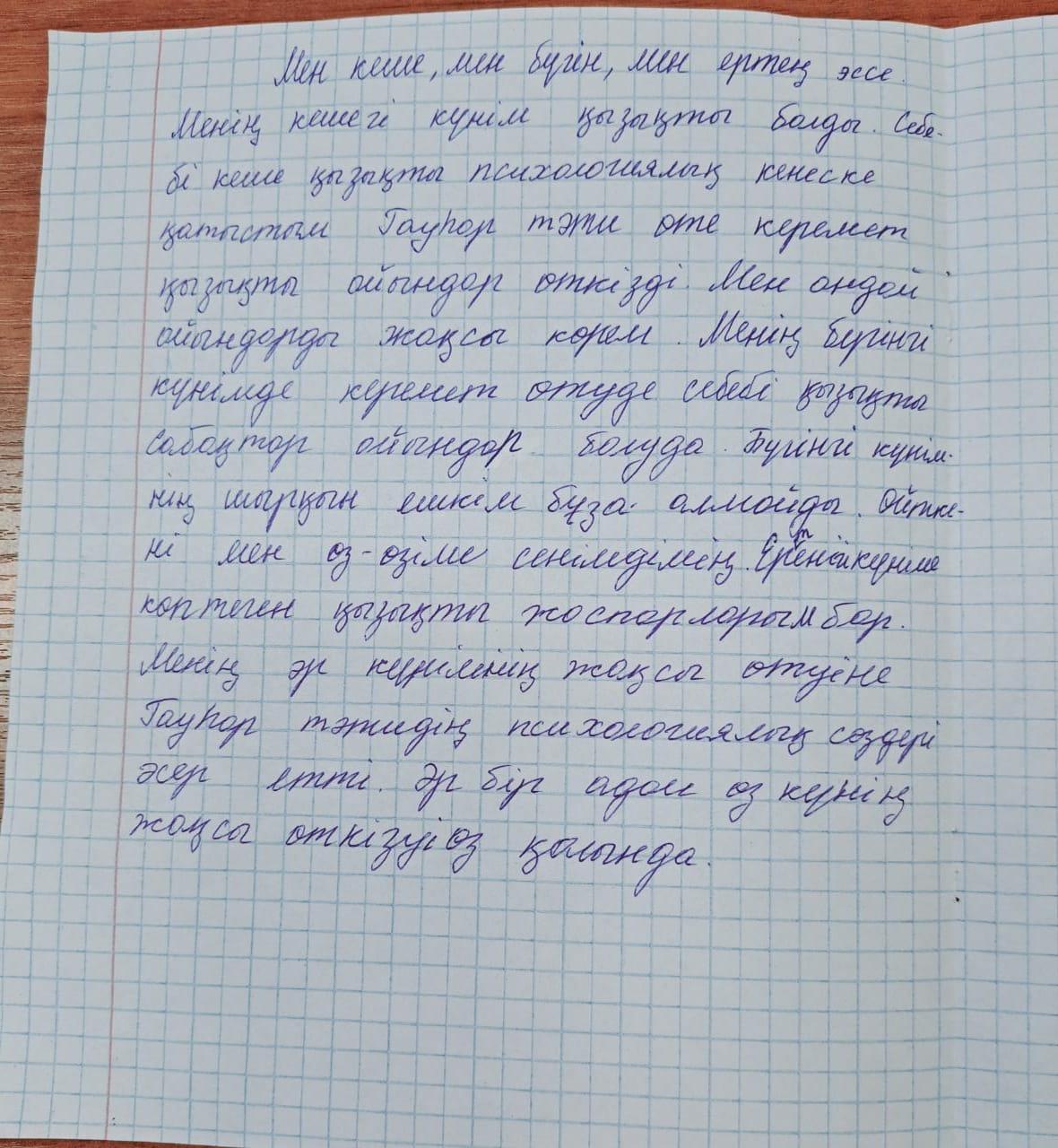 Әлия Молдағұлова атындағы орта мектебінің психологы Жауғашева Гауһар Тасболатқызы 1-4 сынып оқушылары арасында "Баршаға бақыт тілейміз" тақырыбында эссе жазу байқауын ұйымдастырды. 5-7сынып оқушылары арасында "Мен кеше, мен бүгін, мен ертең" тақырыбында эссе жазу байқауын ұйымдастырды.