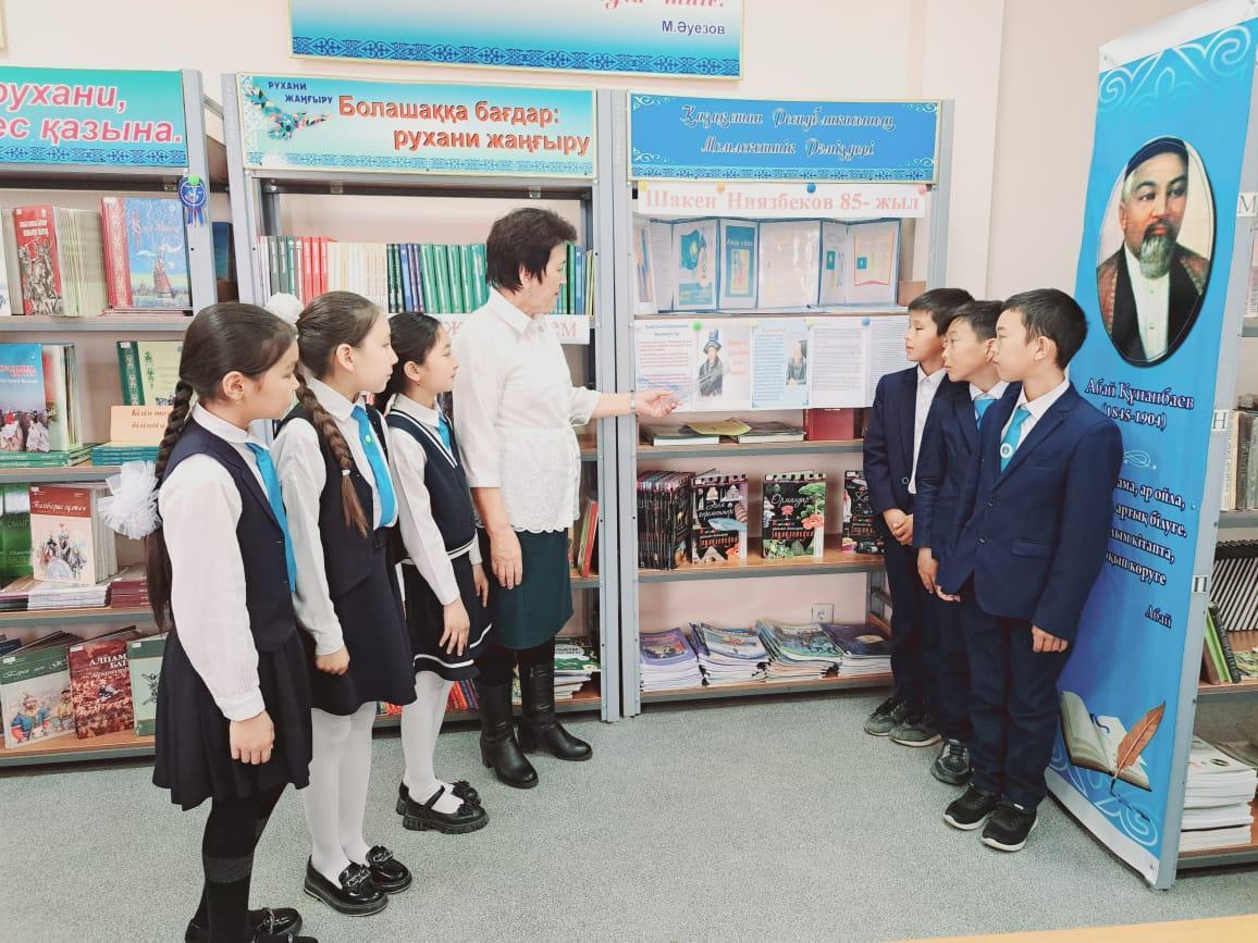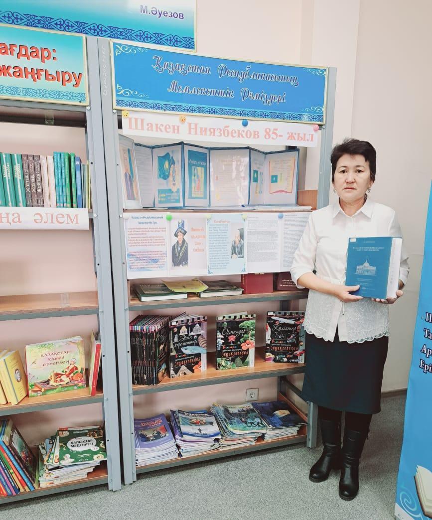 Әлия Молдағұлова атындағы орта мектебінің кітапханасында оқушылардың рәміздер тарихына деген қызығушылықтарын ояту,патриоттық сезімге тәрбиелеу,халқымыздың тарихи өткені мен дәстүрлерін құрметтеуге баулу мақсатында Мемлекеттік Тудың авторы Ш.Ниязбековтың туылғанына 85 жыл толуына орай көрме ұйымдастырылды.
