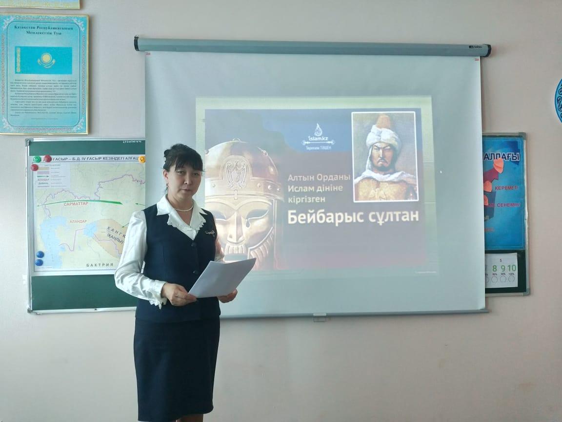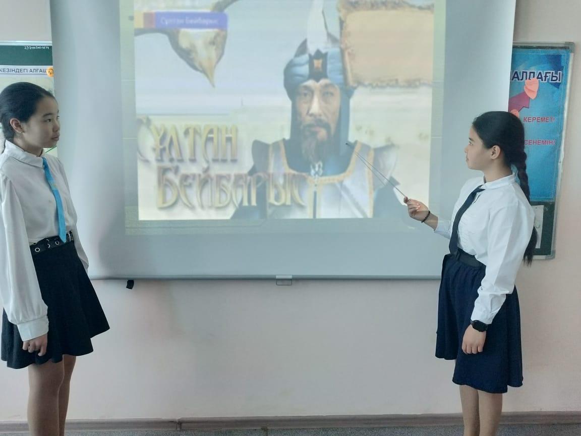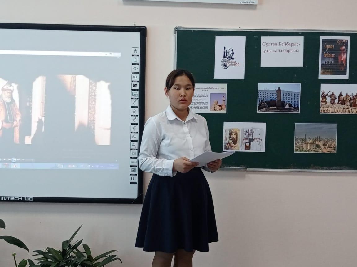 Әлия Молдағұлова атындағы орта мектебінде Сұлтан Бейбарыстың 800 жылдығына орай оқушыларға Сұлтан Бейбарыстың өмірбаяны арқылы тарихи тұлғаларымызға деген қызығушылығын арттыру,адамгершілікке,еңбекқорлыққа,білімге деген құштарлығын арттыру мақсатында 2 – 11 сыныптар арасында «Дара тұлға Бейбарыс», «Сұлтан Бейбарыс – Ұлы дала баласы» тақырыптарында сынып сағаттары өткізілді.