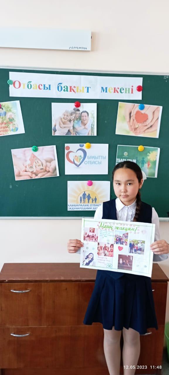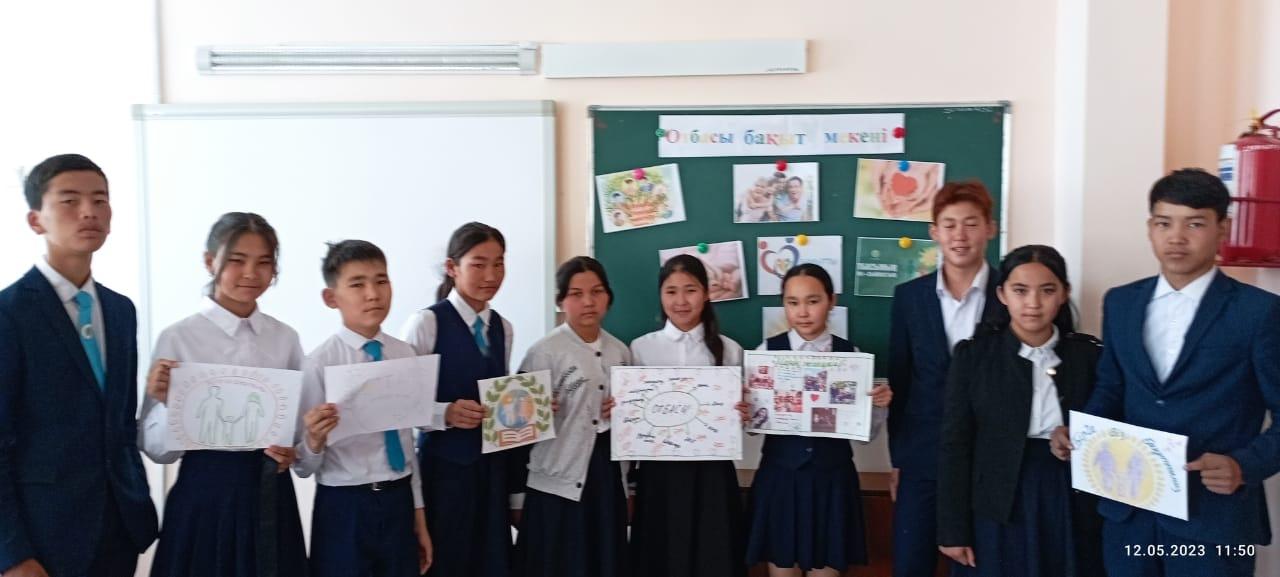Әлия Молдағұлова атындағы орта мектебінде 15 мамыр Отбасы күніне орай отбасылық құндылықтарды арттыру,отбасы беріктігін сақтап,үлкенді сыйлауға,кішіге қамқорлық жасауға,отбасы мүшелерінің арасындағы бауырмалдық,достық қарым – қатынасты қалыптастыру мақсатында 1 – 10 сыныптар арасында «Отбасы – бақыт мекені», «Отбасы – шағын қоғам» атты тақырыптарында сынып сағаттары өткізілді.