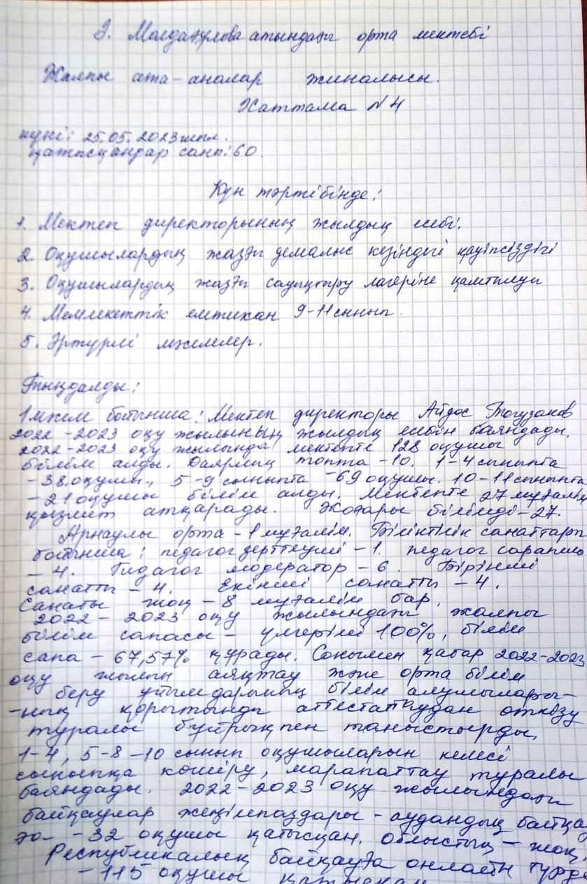 Әлия Молдағұлова атындағы орта мектебінде 2022 – 2023 оқу жылының аяқталуына байланысты жалпы мектепішілік ата – аналар жиналысы өтті.