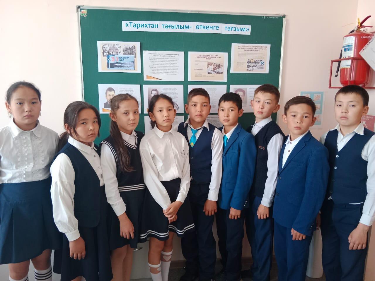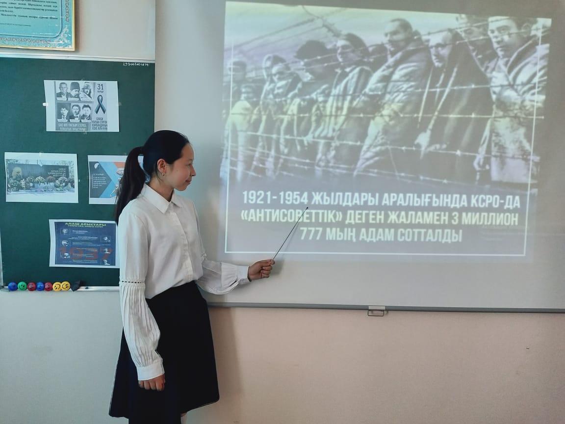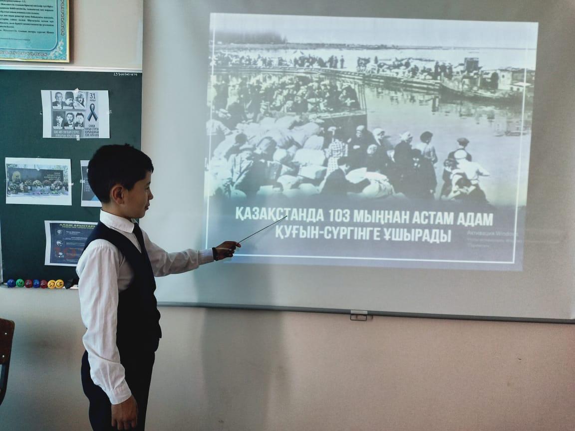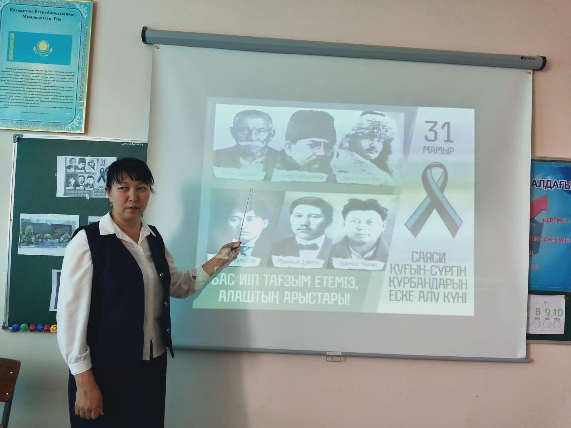 Әлия Молдағұлова атындағы орта мектебінде 31 мамыр қуғын – сүргін және ашаршылық құрбандарын еске алу күніне орай 1 – 11 сынып жетекшілері «Тарихтан тағылым – өткенге тағзым» тақырыбында сынып сағаттарын өткізді.Бұл күн қазақ халқының жанына жара салған уақытты еске алу,аза тұту күні екенін естен шығармаған жөн.Осы бір зұлмат жылдарда Сталиндік лагерде тұтқында отырғандар қайғы жұтып ұлт зиялыларынан айырылдық.Тек өткенге салауат айтып халқымыздың әр өткен оқиғасын жас ұрпаққа жете түсіндіріп,ұлтжанды азаматтар тәрбиелеу басты парызымыз.