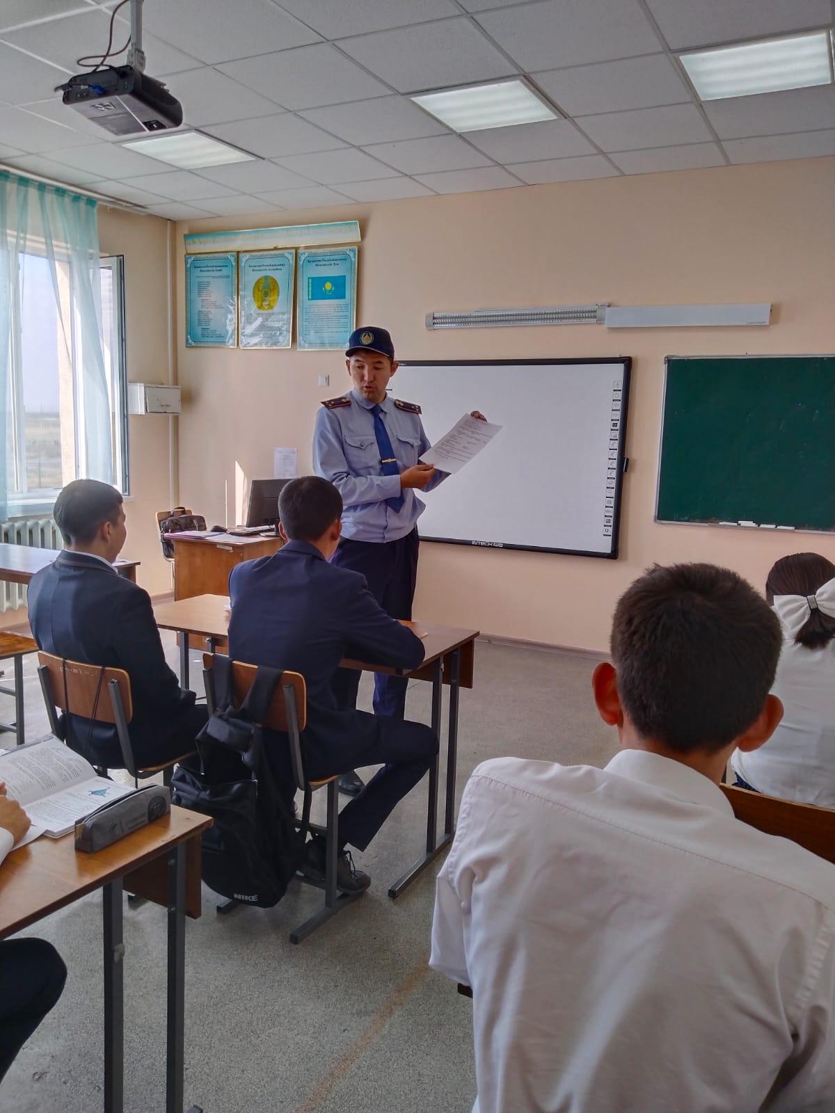 Әлия Молдағұлова атындағы орта мектебінде 13 қыркүйек күні Шу АПБ – нің ЖПҚ полиция аға лейтенанты Қ.Ж.Иманбаев 7 – 11 сынып оқушылары арасында жаман әдеттерден аулақ болуға,құқық бұзушылықтың алдын алу мақсатында «Болашақ есірткісіз!», «Есірткіге жол жоқ!» тақырыптарында түсіндірме жұмыстарын жүргізді.
