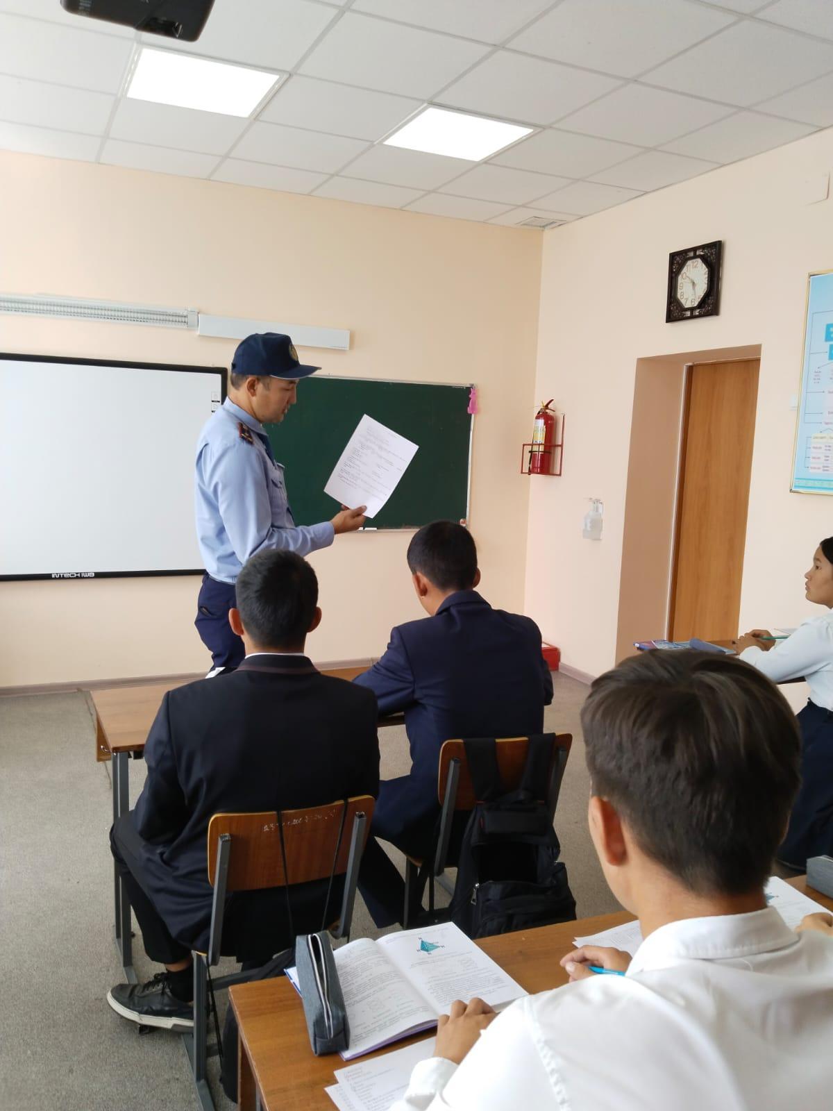 Әлия Молдағұлова атындағы орта мектебінде 14 қыркүйек күні Шу АПБ – нің ЖПҚ полиция аға лейтенанты Қ.Ж.Иманбаев 7 – 11 сынып оқушылары арасында құқық бұзушылықтың алдын алу,құқықтық сауаттылығын арттыру мақсатында «Қауіпсіз мектеп» тақырыбында жедел – профилактикалық іс – шарасы аясында түсіндірме жұмыстарын жүргізіп,бопсалауға байланысты жасырын сауалнама алынды.