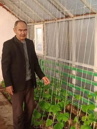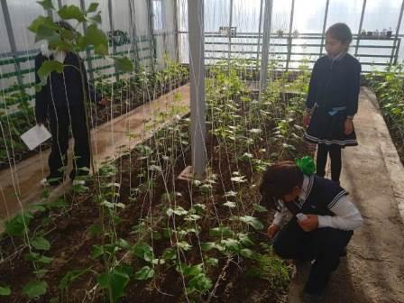 Р. Батырбеков пен оқушылар мектеп жылыжайында көкөністерді баптап өсірумен айналысуда.