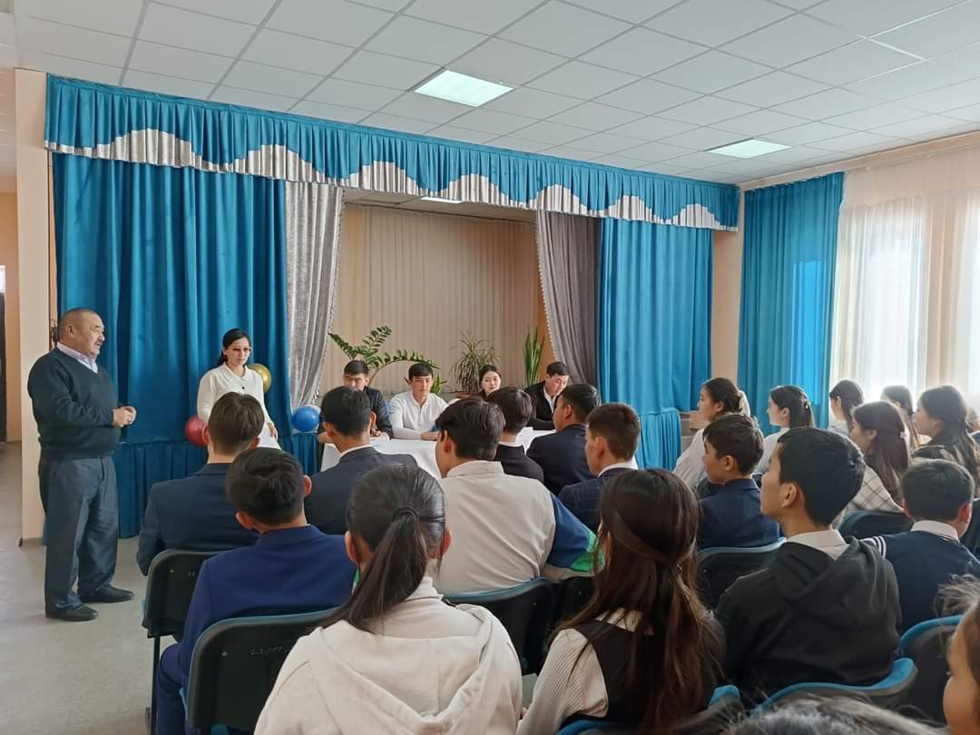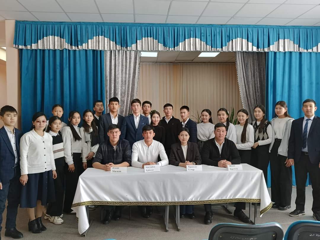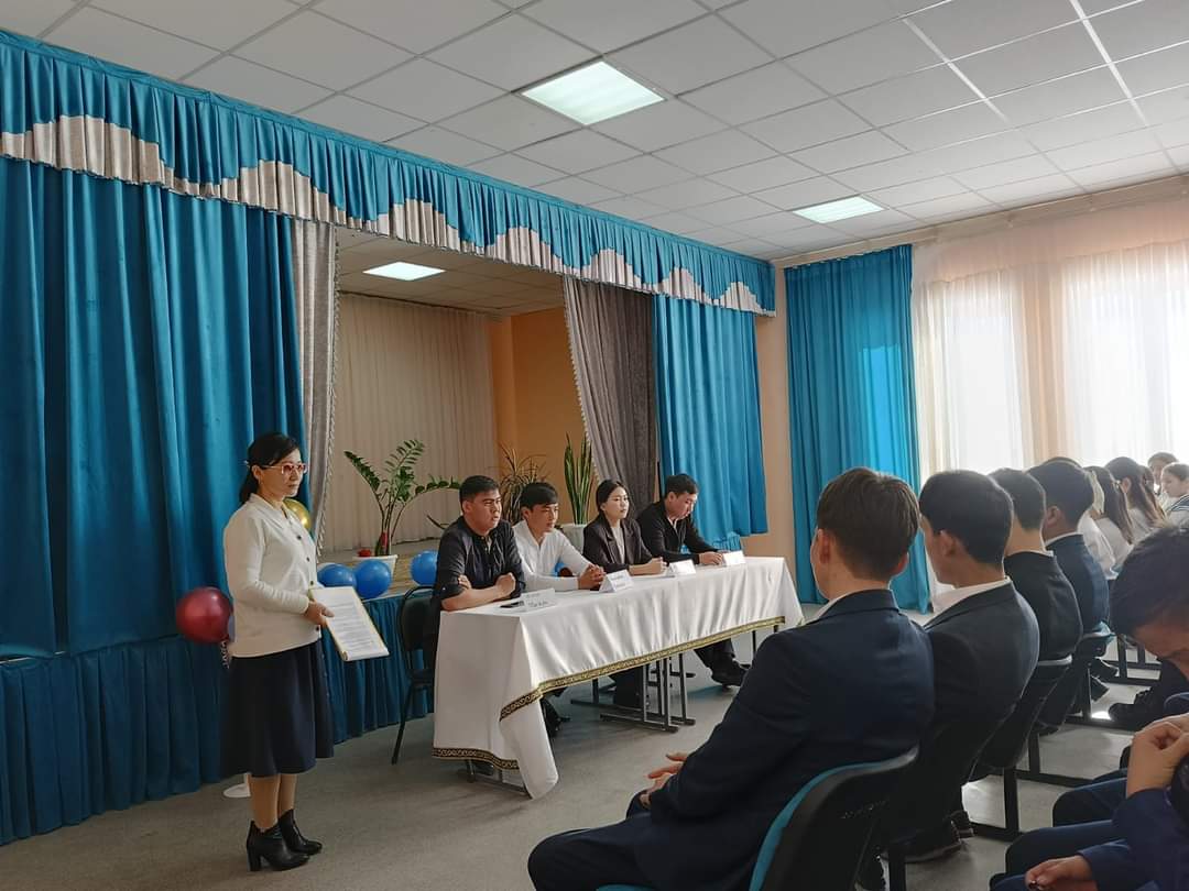 факультетінің 3 курс студенті Шәми Нұртілеу Сәкенұлы қатысып, оқушыларға ақыл- кеңестер айтып, ҰБТ -ге сәттілік тіледі. Кездесудің мақсаты: мамандық таңдауға байланысты кәсіби бағдар беру, адам өмірінде мамандықтың алатын орыны, маңызы туралы түсініктерін кеңейту. Оқушыларды шыдамдылыққа баулу, үлкен өмірге дайындау.