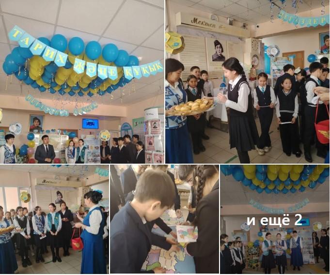 Мектеп фоесінде көрме жасалып, "Атаулы күндер" аясында түрлі тарихи тұлғалардың суреттерімен безендірілді. Мектеп директоры А. Е Тогузаков айлық барысында оқушыларға сәттілік тіледі. Оқушылар "Мозайка" әдісі арқылы Қазақстан картасын құрастырып, тарихи суреттерді сипаттап, қоржындағы сұрақтарға жауап беріп, белсенділік танытты.