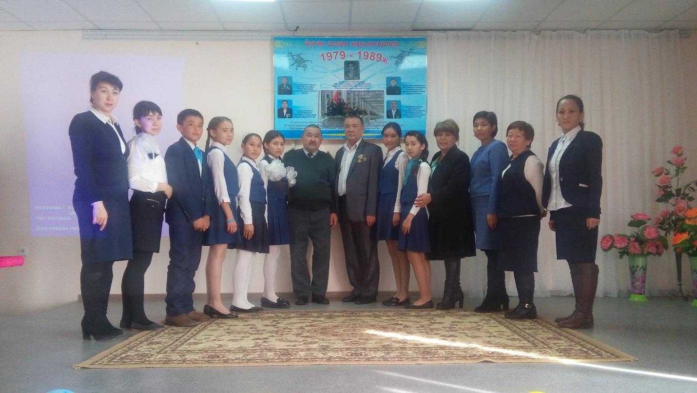 15 ақпан 2018 күні Кеңес әскерлерінің Ауғанстан жерінен шығарылғанына 29 жыл толуына орай жастарды отансүйгіштікке тәрбиелеу мақсатында мектепте жоспар бойынша бірқатар жұмыстар атқарылды. Мектеп кітапханашысы Б.Молдахунованың ұйымдастыруымен «Ешкімде ешқашан ұмытылмайды» кітап көрмесі жасалынды. 2-3-4-5 сыныптар арасында сынып жетекшілердің ұйымдастыруымен «Болмасын, соғыс болмасын!» атты сурет байқауы өтілді. 5-сыныпта Жаслан Қарақаттың суреті үзік деп танылып, марапатталды.Тарих пәні мұғалімі А.Айдаркулованың ұйымдастыруымен «Ауғанстан ақиқаты» тақырыбында 11-сыныпта бейне роликтер көрсете отырып,ауған соғысы жайында көптеген мағлұматтар берді.5-сыныпта К.Құрманбекованың ұйымдастыруымен «Мен елімнің жас патриотымын» тақырыбында сынып сағаты өтілді. Мақсаты:жас ұрпақтың патриоттық сезімдерін оятып,Отан үшін отқа түскен жауынгерлердің ерліктерімен таныстыра отырып,елжандылыққа, отансүйгіштікке, ізгілікке баулып тәрбиелеу.13-ақпан күні АӘД пәні мұғалімі Қ.Қанафин және Тәлімгер Б.Джилкибаеваның ұйымдастыруымен «Ауған асқан жауынгерлер» атты кездесу кеші болып өтті. Кездесу кешіне ауған соғысына қатысқан жауынгерлер Қ.И.Төлеуов, Көкеев Дәулет пен Көкеев Мұхтар сияқты қадірлі қонақтары шақырылды. Кездесу кешті мектеп басшысы Қ.М.Бабасова ашып,іс-шараның маңыздылығын атап, ауған соғысына қатысқан жауынгерлерге алғысын айтты.Оқушылар қонақтарға өз ойларында жүрген сұрақтарын қойып, жауаптарын алды.Ерлердің ерлігін кейінгі ұрпаққа үлгі ете отырып,жастарды ұлтжандылыққа,Отанын сүюге тәрбиелеуді мақсат тұтқан кеште ұл-қыздар Отан,туған жер,ерлік жайындағы ақын жазушылардың өлеңдерін оқып,тарихи кезеңге шегініс жасады.