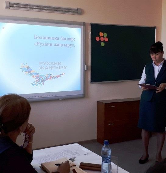 «Рухани жаңғыру» қоғамдық сананы жаңғырту бағдарламасының «Тәрбие және білім» кіші бағдарламасының мақсаты-біртұтас ұлттық бәсекеге қабілетті, сындарлы, күшті, шығармашылық, патриот және белсенді тұлғасын қалыптастыру, жетістікті болашақтың іргетасы тәрбие мен білім беру салты болып табылатынын осы мақсаттарды жүзеге асыруда мектепте атқарылып жатқан іс-шараларды айтып, ата-аналарды таныстырып өтті.