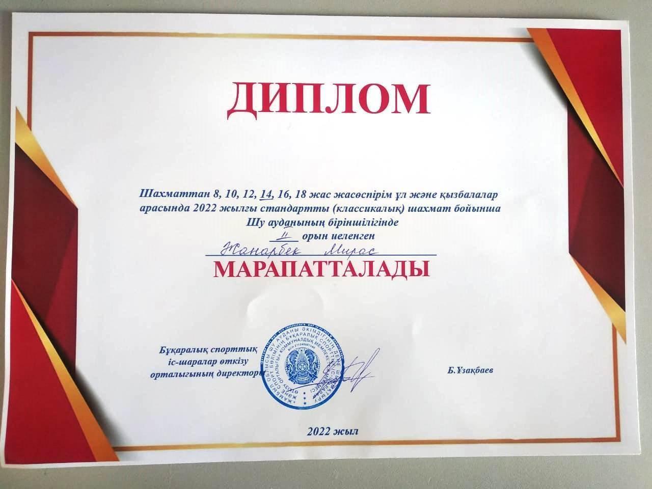 Әлия Молдағұлова атындағы орта мектебінде Балалар жылына орай шахматтан 14 жас жасөспірім ұл мен қыз балалар арасында 2022 жылғы стандартты шахмат бойынша Шу ауданының біріншілігінде 7 сынып оқушысы Жанарбек Мирас II орынды иеленіп,дипломмен марапатталды.