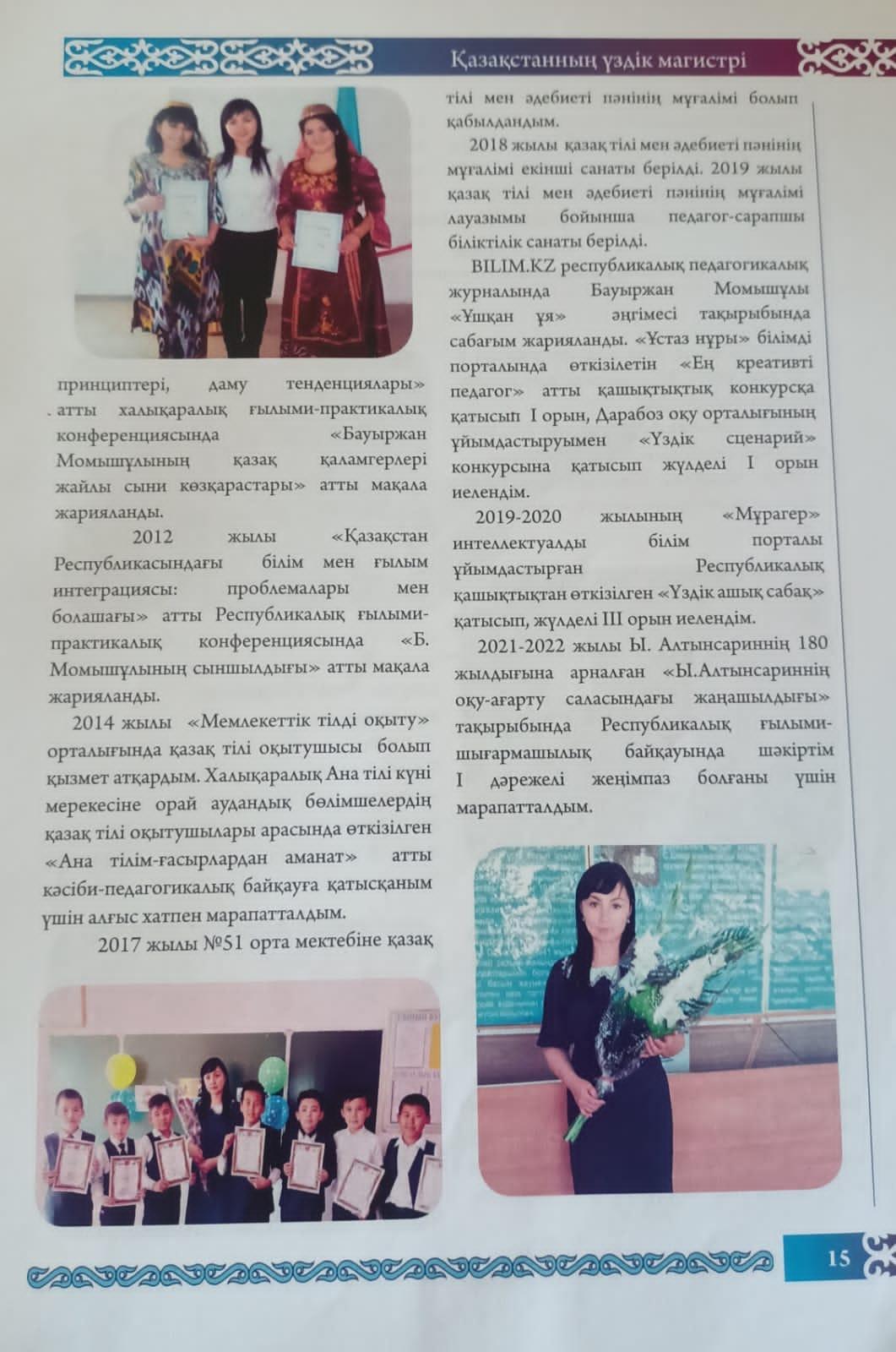 Ауылда білім алып, өзімнің жолымды таңдаған оқушыларымның жеткен жетістіктеріне Гульзаданың «Қазақстанның үздік магистрі» , Нургулдің «Жылдың үздік педагогы» атағын алғандарына қуанып отырмын. Екі тал шыбықтай қыздарымыздың бүгінгі күн аяулы ана, қадірлі ұстаз, жан- жақты , қабілетті әріптес болып жүргендері балалық шақтағы таңдап алған мамандықтарының мол жемісінің «өнімі» деп ойлаймын. Оқушы кезінде әр дайындыққа , жарыстарға қиналмай жіберген «Ата –аналарына» да мың алғыс. «Шәкіртсіз ұстаз –тұл» демекші Гульзада, Нургуль сендердің де білімді шәкірттерің көп болсын. «Ұстаздан шәкірт озар» деген ұлы сөздің жүрекке жылылық бергені, менің кішкентай ғана еңбегімнің «Шоқтай болған көрінісі» екеніне қуандым.