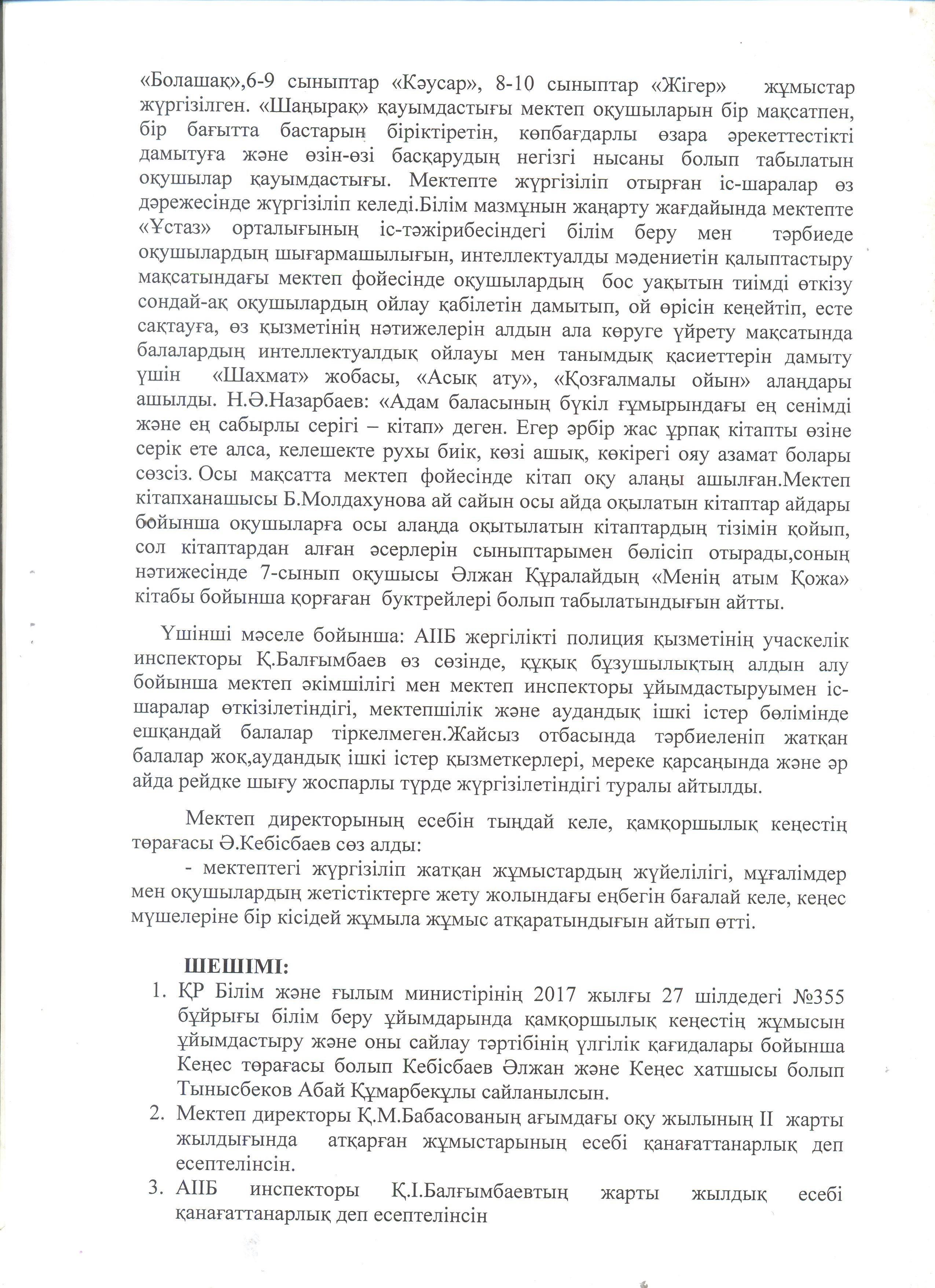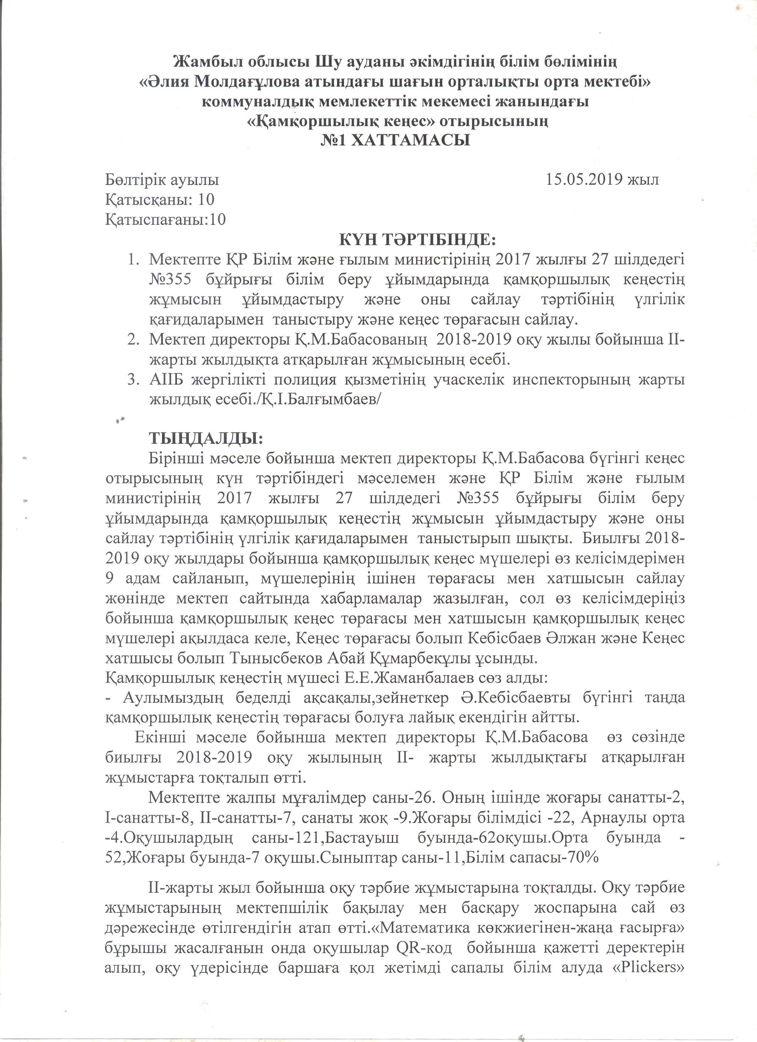 Қамқоршылық кеңес хаттамасы » "Әлия Молдағұлова атындағы орта мектебі" КММ