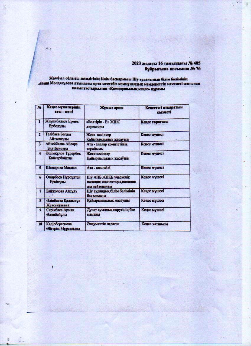 Қамқоршылық кеңес бұйрығы мен құрамы.2023 жыл. » "Әлия Молдағұлова атындағы орта мектебі" КММ