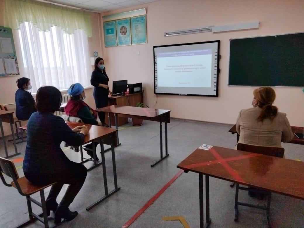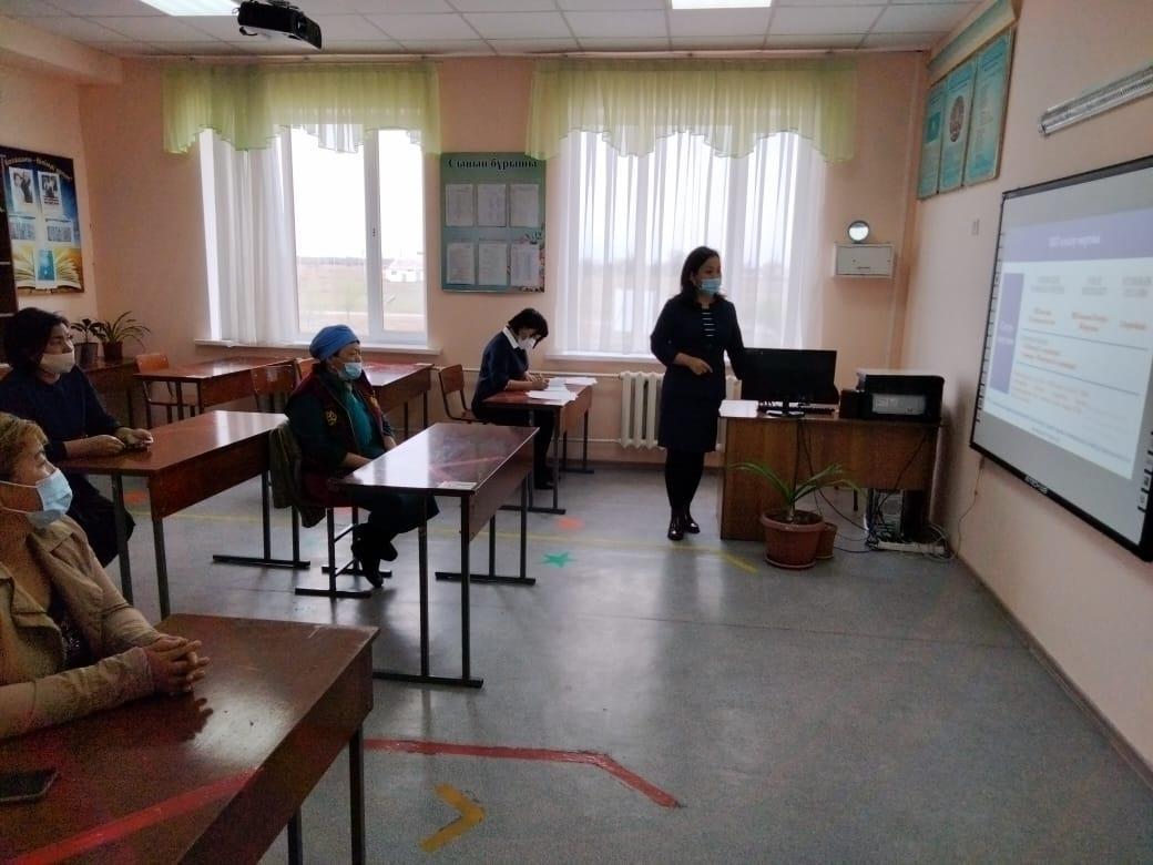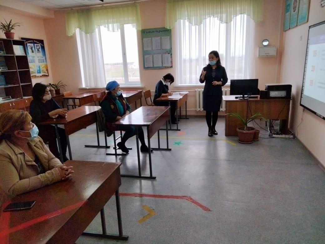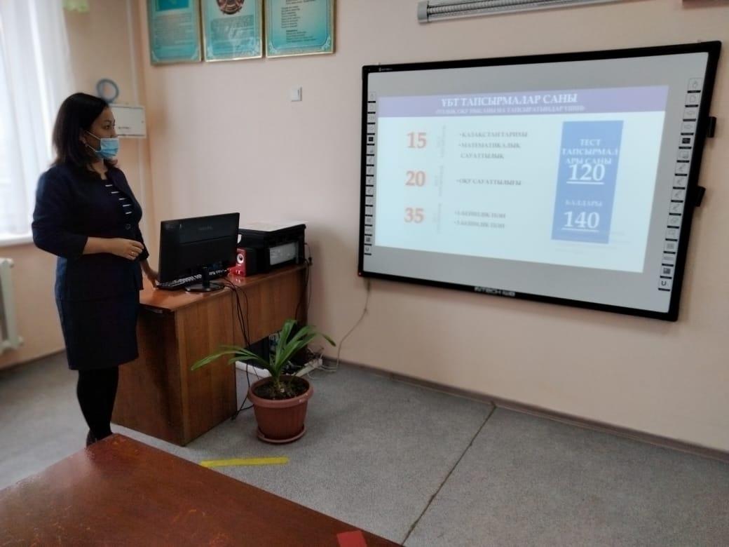 2021 жылдың 21 сәуір күні Ә.Молдағұлова атындағы орта мектебінде 11 сынып жетекшісі Б.Джилкибаева мен директордың оқу ісі жөніндегі орынбасары З.Диханбаева ата-аналармен электрондық форматтағы ұлттық бірыңғай тестілеуді ұйымдастыру бойынша түсіндіру жұмыстарын жүргізді.