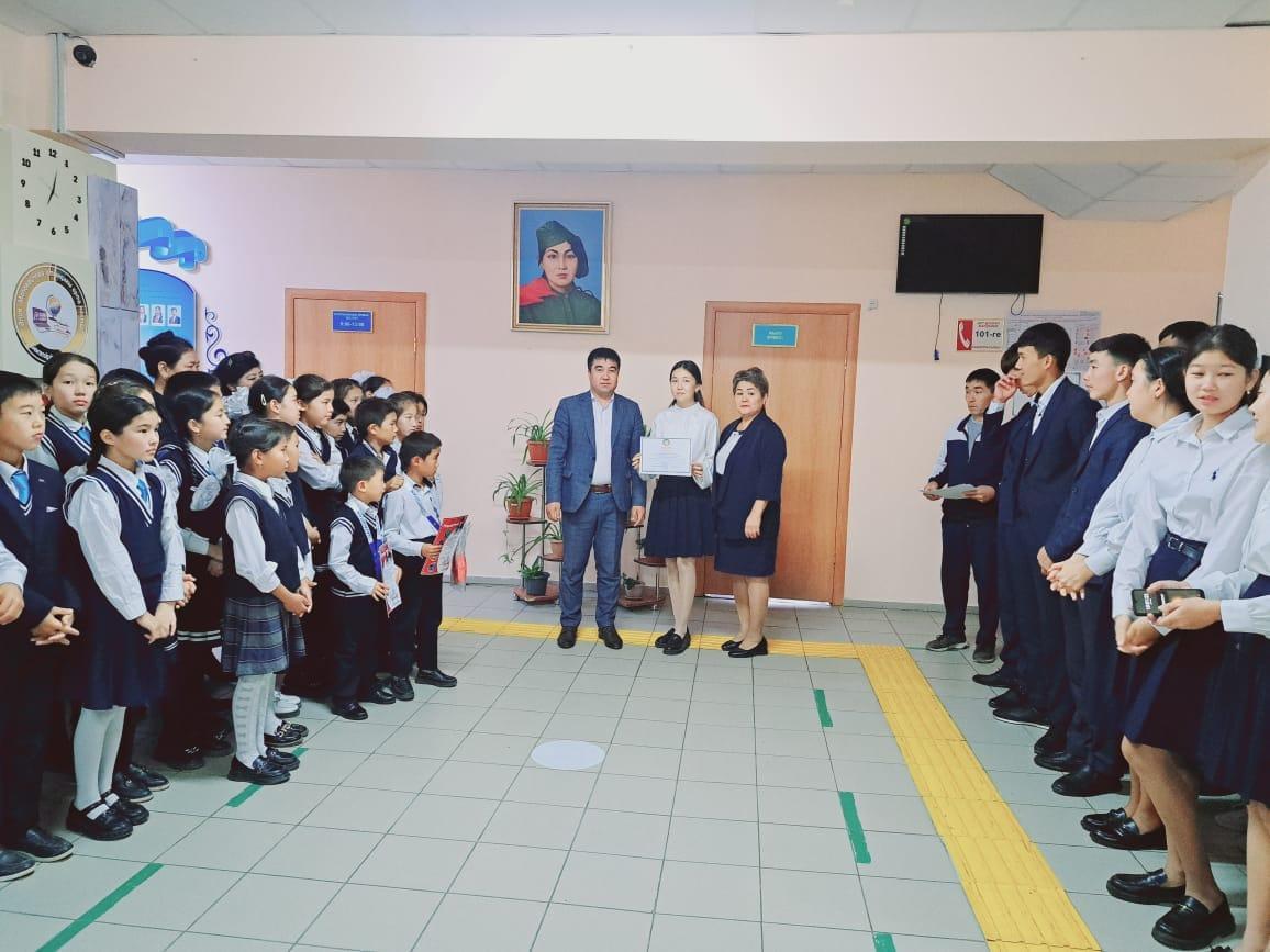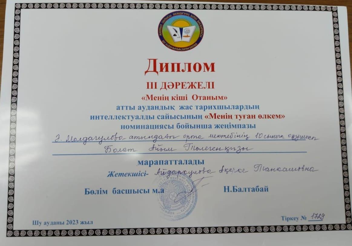 «Менің кіші Отаным» атты аудандық жас тарихшылардың интеллектуалды сайысының «Менің туған өлкем» номинациясы бойынша Ә. Молдағұлова атындағы орта мектебінің 10 сынып оқушысы Болат Айым lll дәрежелі дипломмен марапатталды