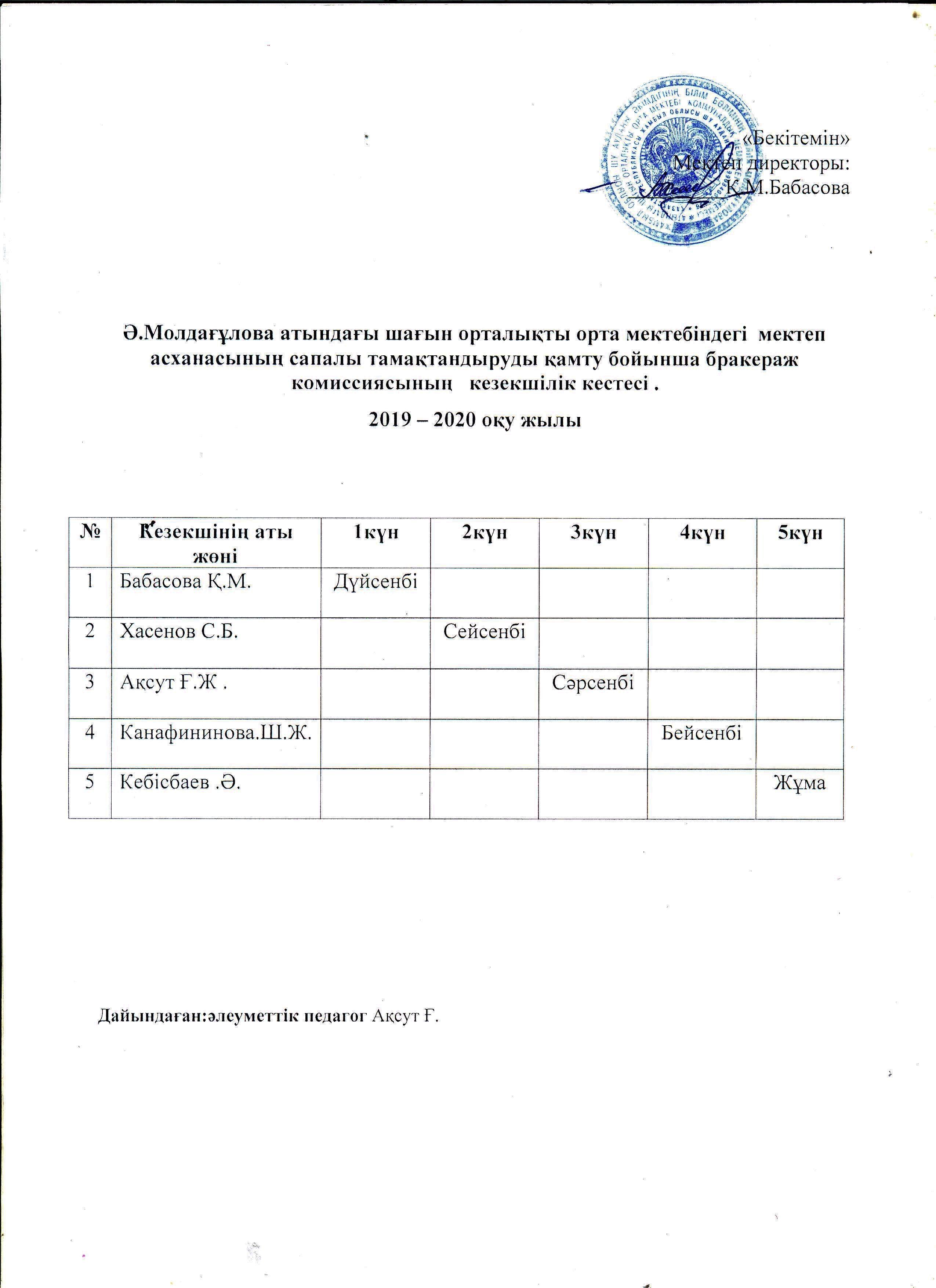 Бракиражды комиссиясының кезекшілік кестесі » "Әлия Молдағұлова атындағы орта мектебі" КММ