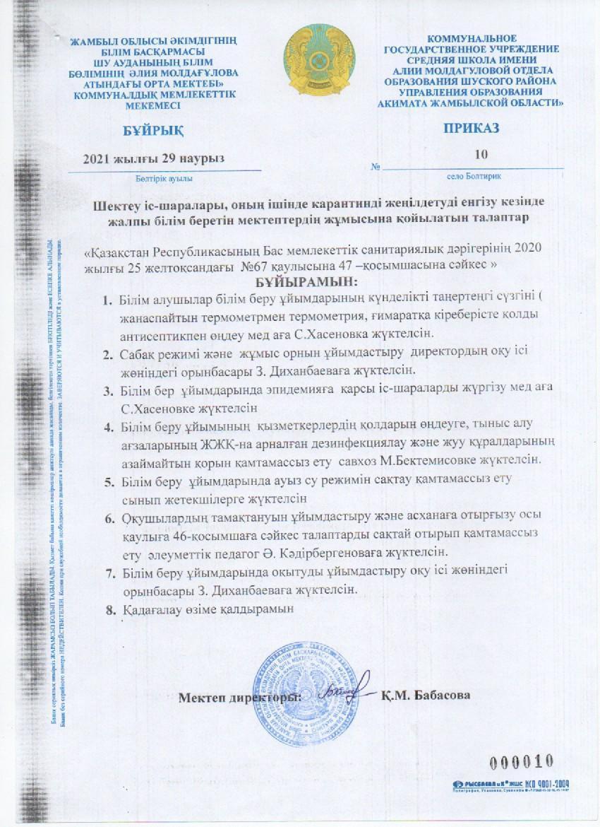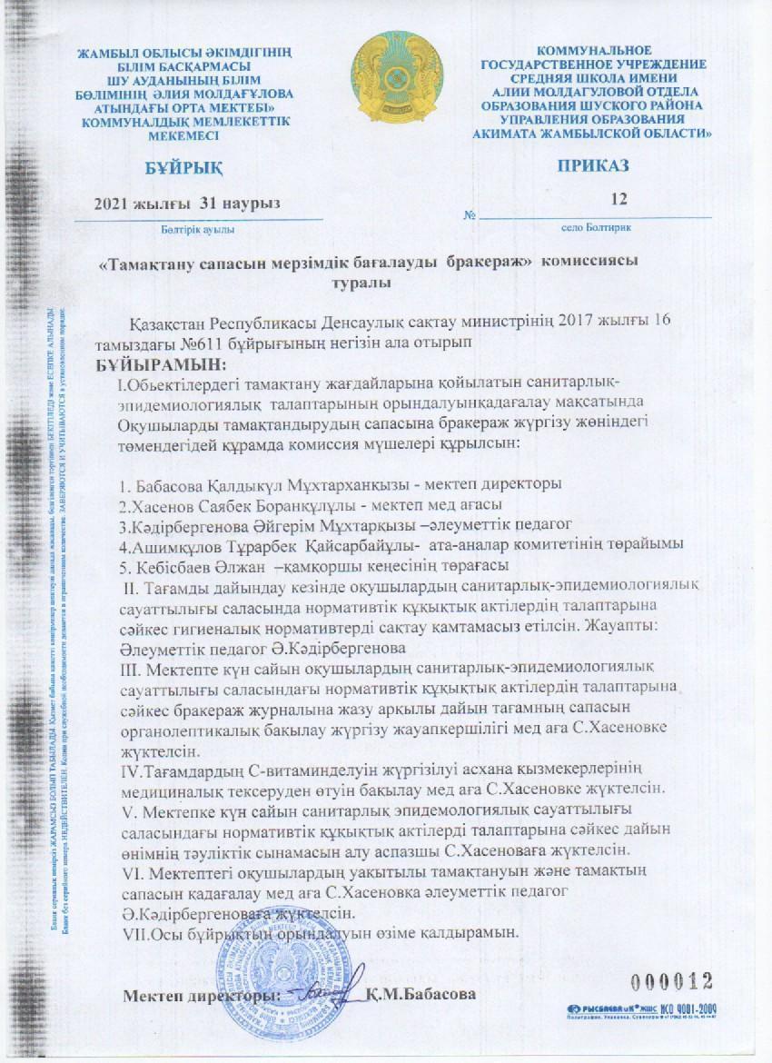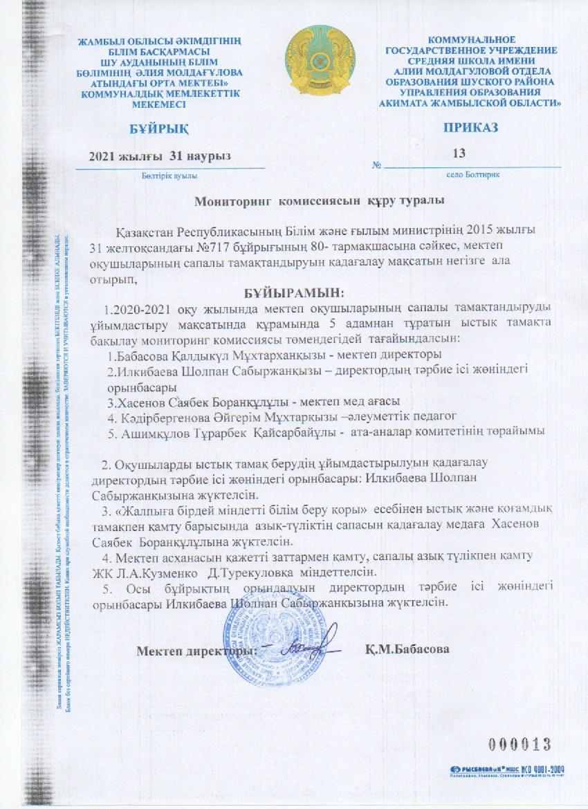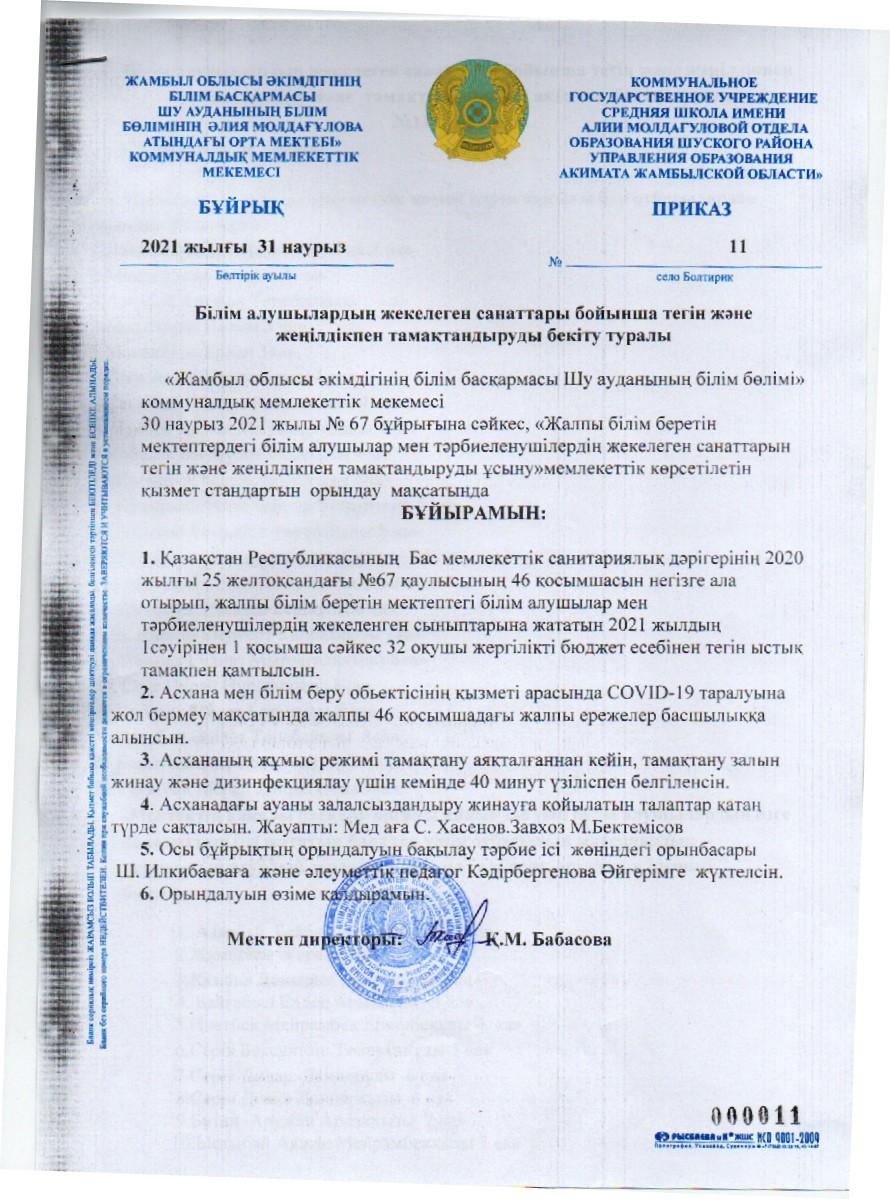 Ыстық тамаққа байланысты бұйрықтар » "Әлия Молдағұлова атындағы орта мектебі" КММ