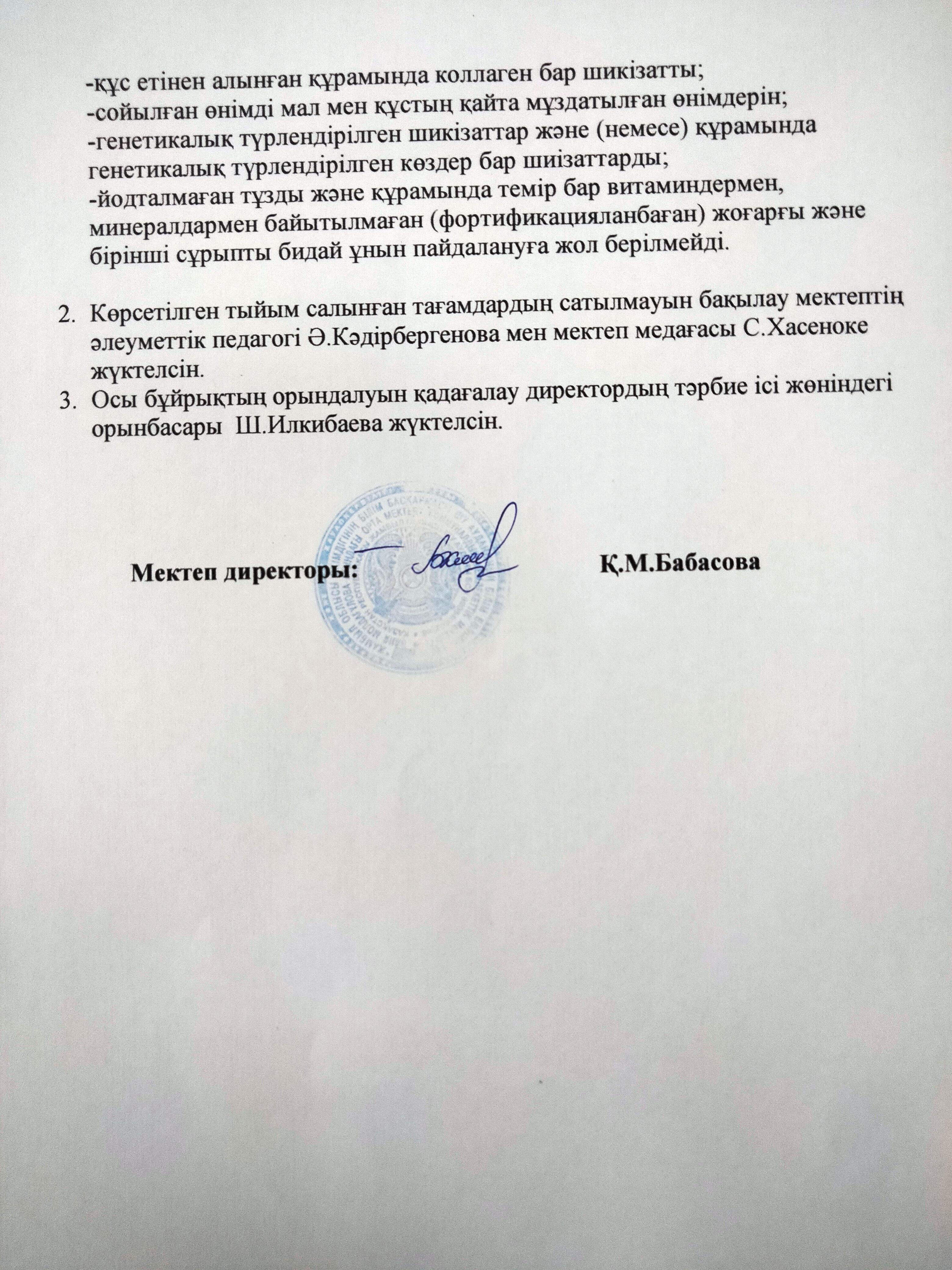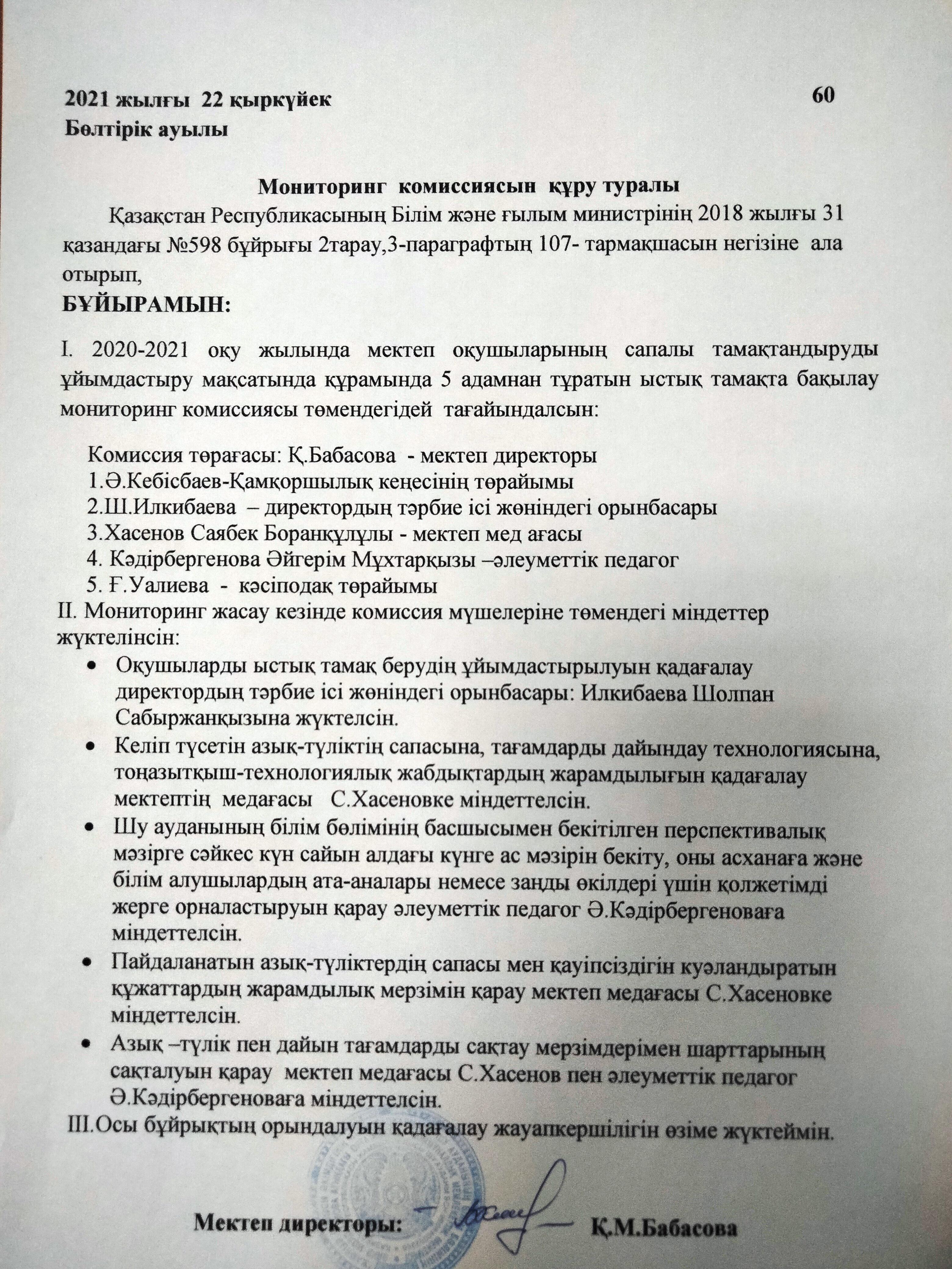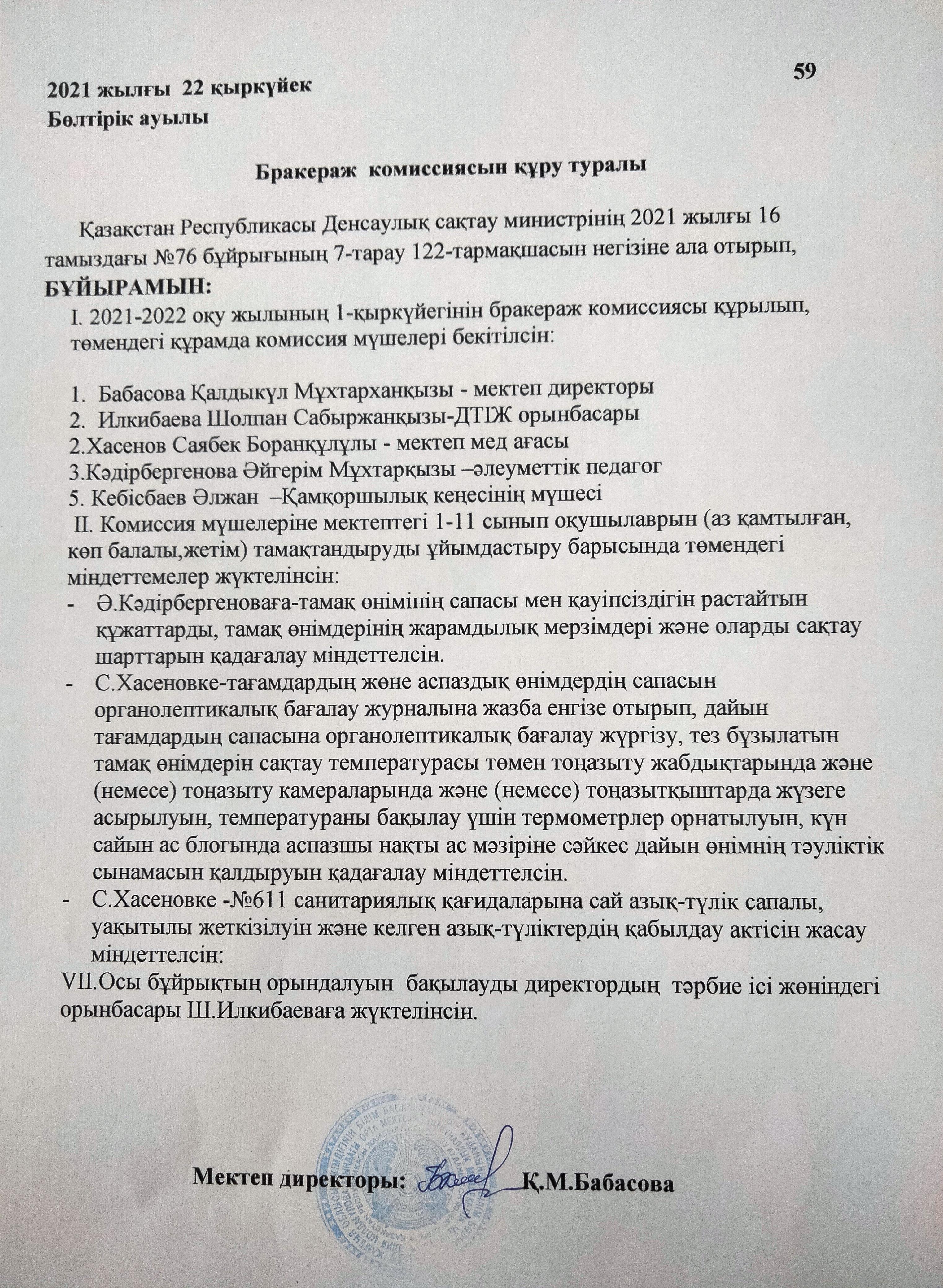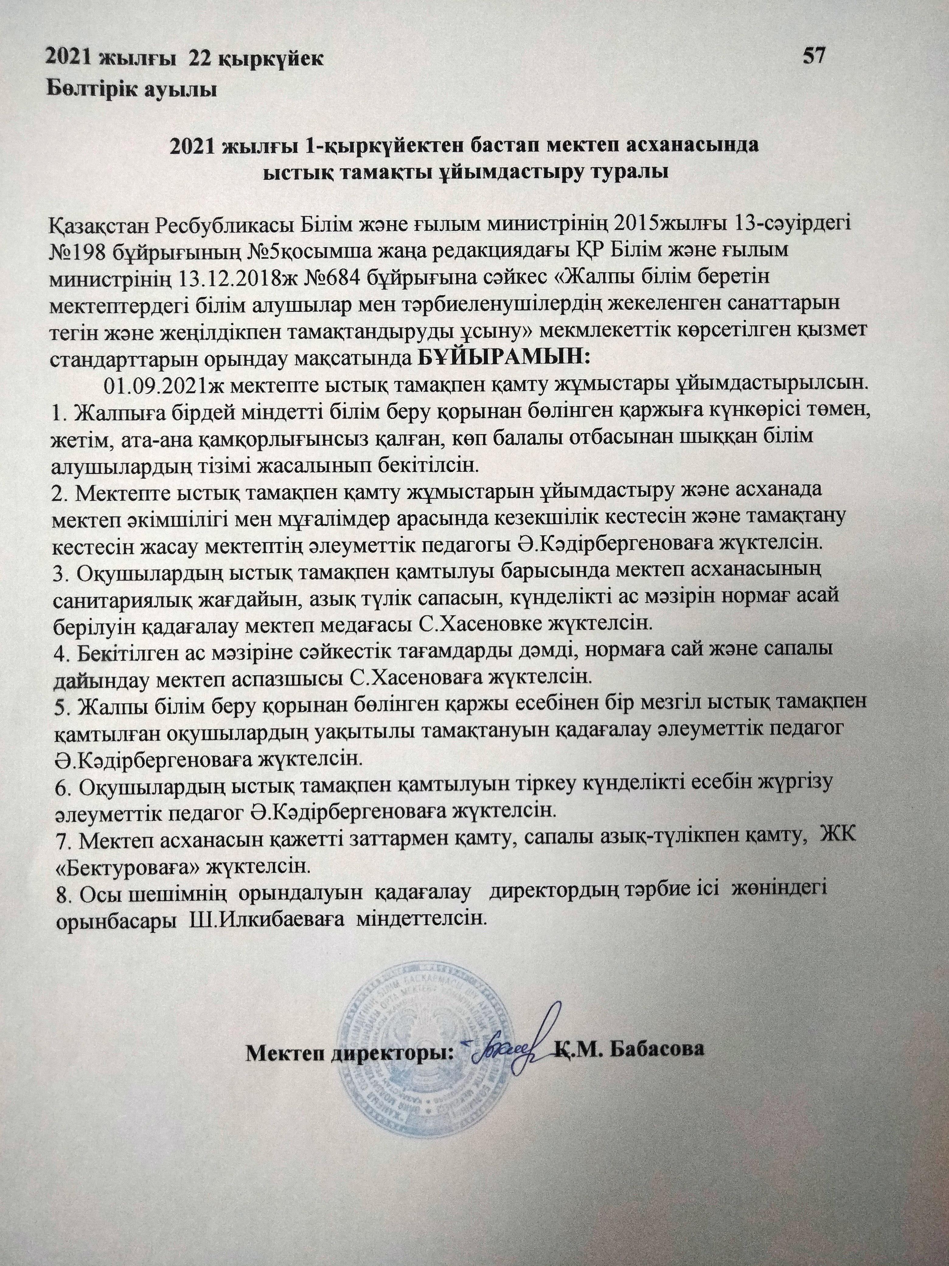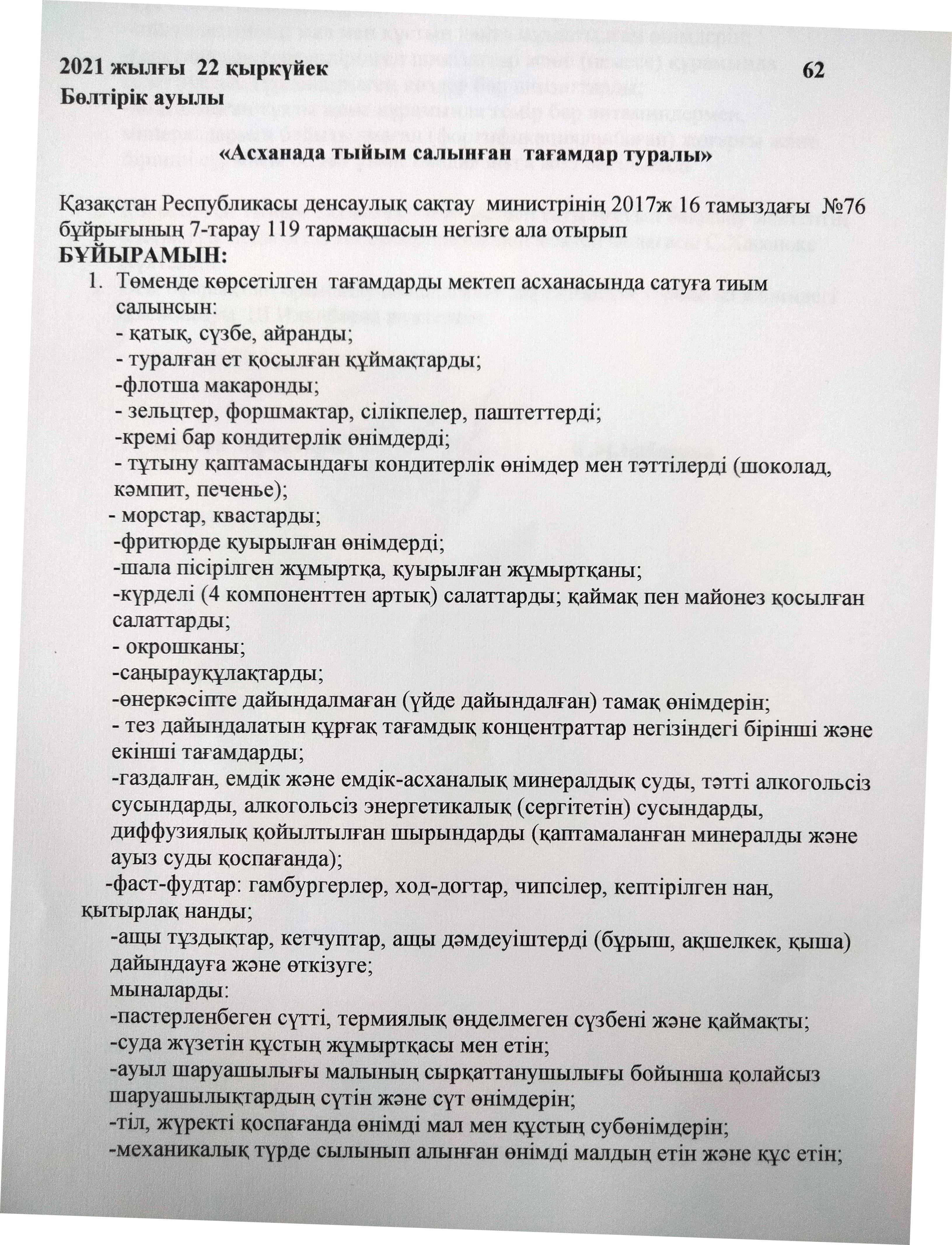 22 қыркүйек 2021 0 1 2 3 4 5 Ыстық тамаққа байланысты бұйрықтар тізбесі ЫСТЫҚ ТАМАҚПЕН ҚАМТУ ТУРАЛЫ БҰЙРЫҚ ЫСТЫҚ ТАМАҚТЫ ҰЙЫМДАСТЫРУ ТУРАЛЫ БҰЙРЫҚ БРАКЕРАЖ КОМИССИЯСЫН ҚҰРУ ТУРАЛЫ БҰЙРЫҚ АСХАНАДА ТЫЙЫМ САЛЫНҒАН ТАҒАМДАР ТУРАЛЫ БҰЙРЫҚ