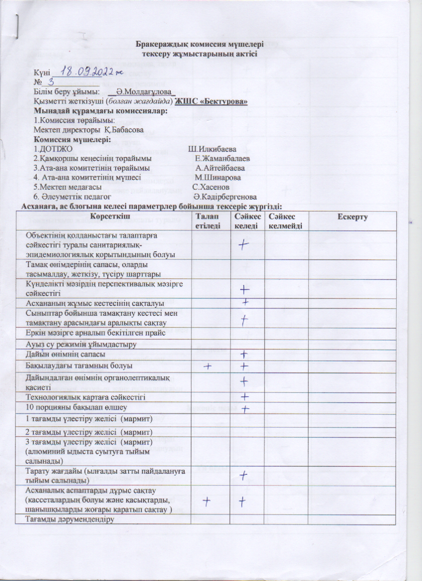 Бракераж актісі. 2022 ж » "Әлия Молдағұлова атындағы орта мектебі" КММ